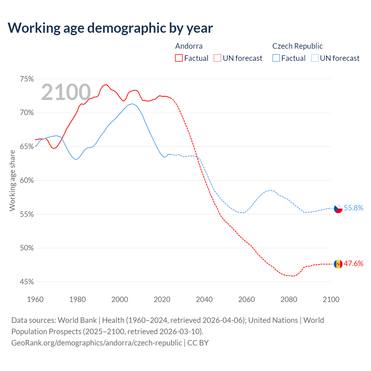 - Andorra has 60.7K working age adults (aged 15-64) vs 6.79M in the Czech Republic.
