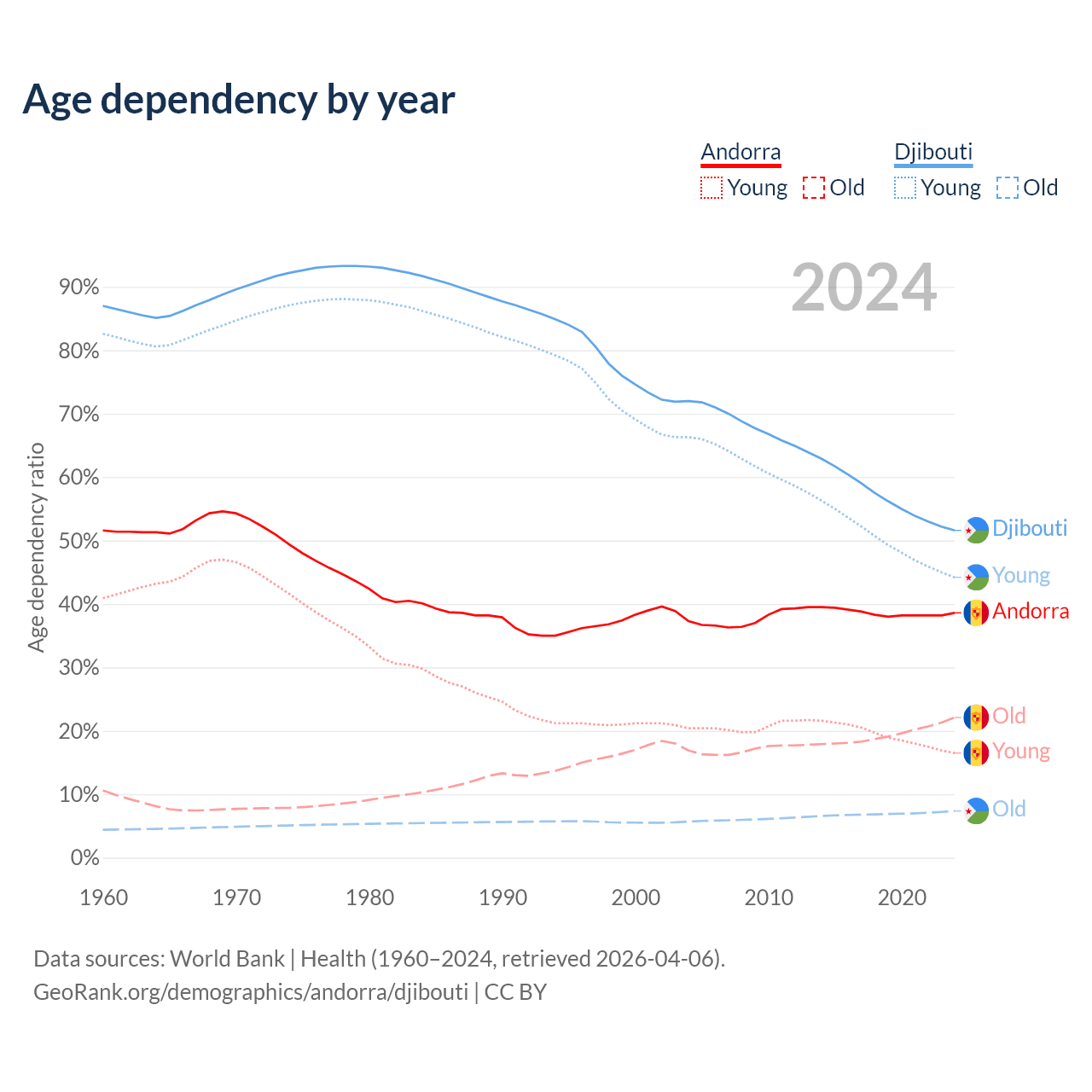 - The share of old-age demographic (65+) in Andorra is 15.9% vs 4.85% in Djibouti.