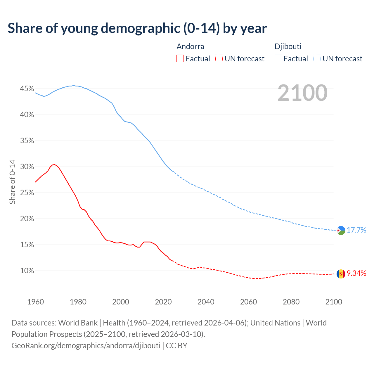 - The share of young demographic (0-15 years old) in Andorra is 11.9% vs 29.2% in Djibouti.