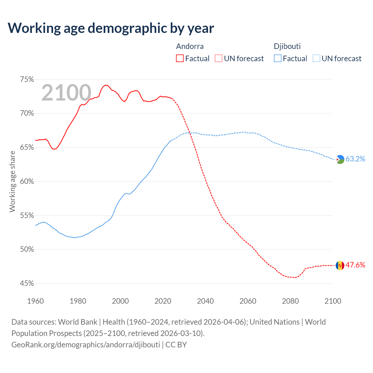 Median age Andorra vs Djibouti, 1960-2100