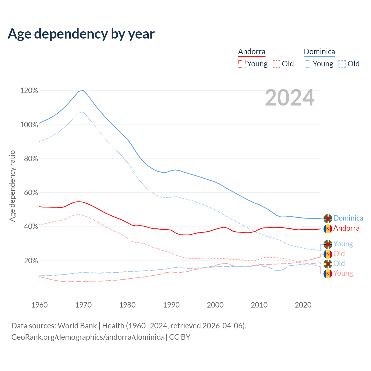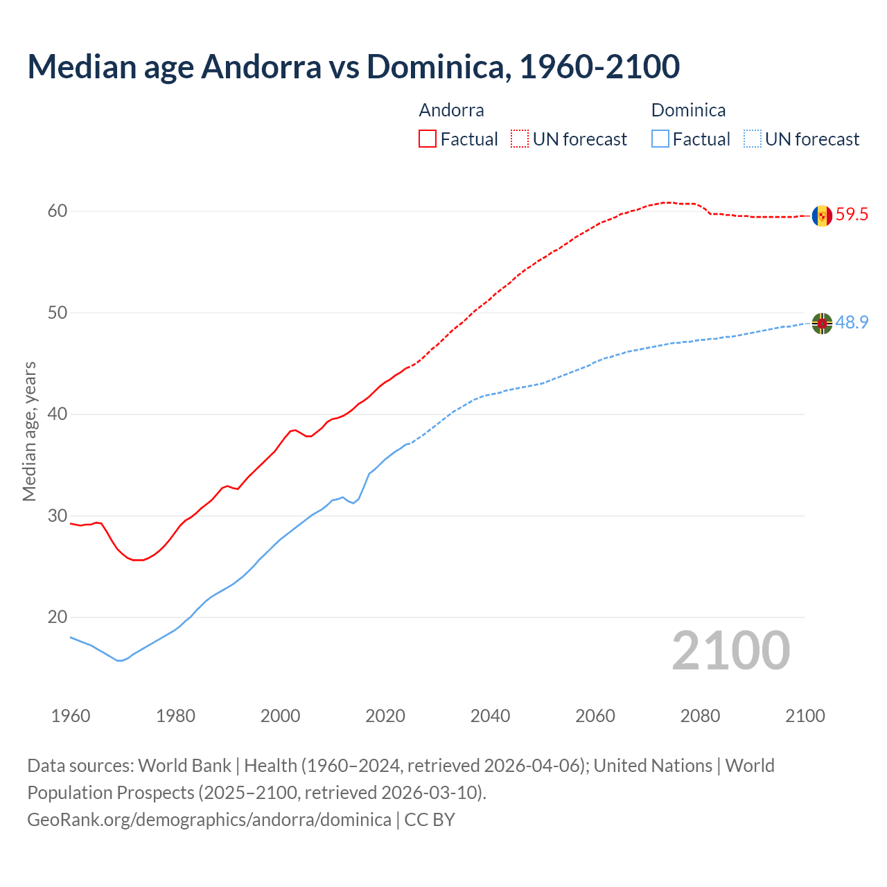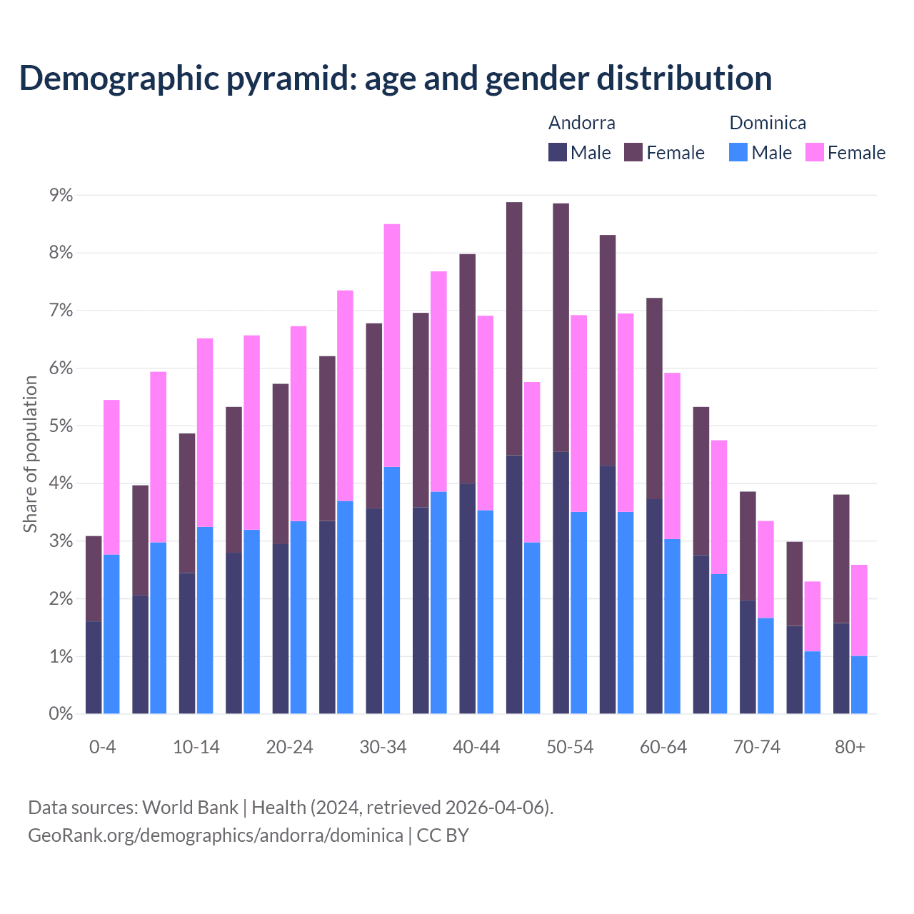 - Andorra is ranked 18/196 by median age (oldest to youngest) vs 66/196 for Dominica.