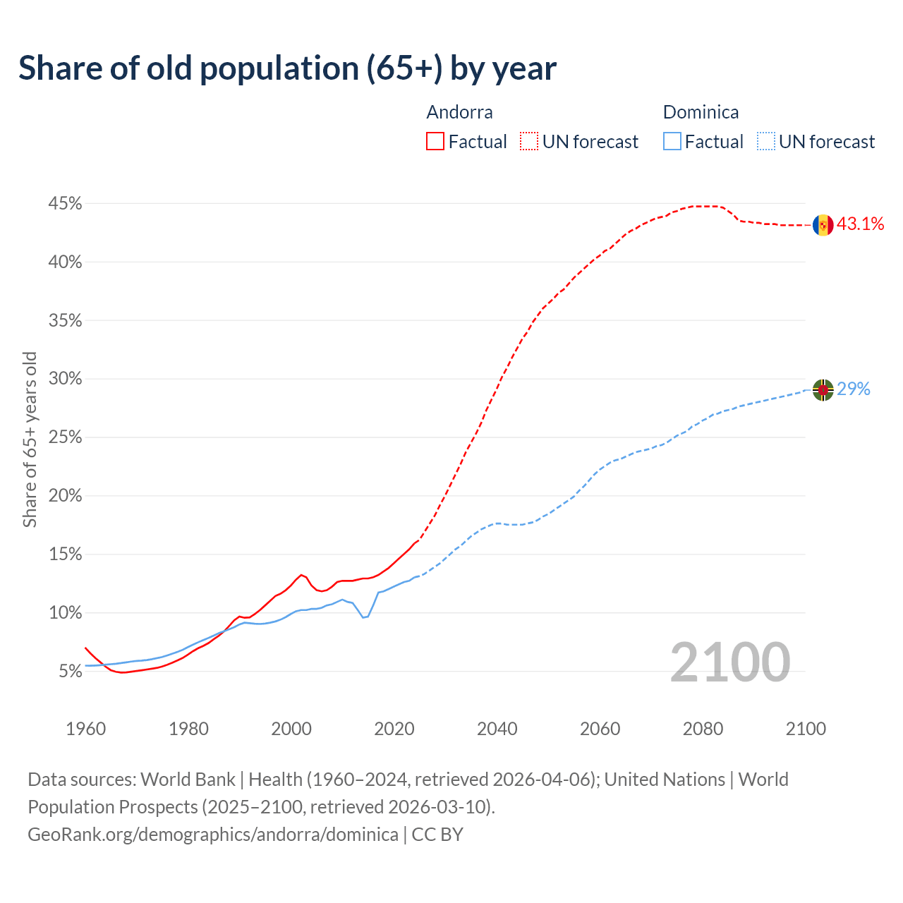 The share of older people aged 65 and over is 15.9% in Andorra and 13% in Dominica. Life expectancy in Andorra compared to Dominica .
