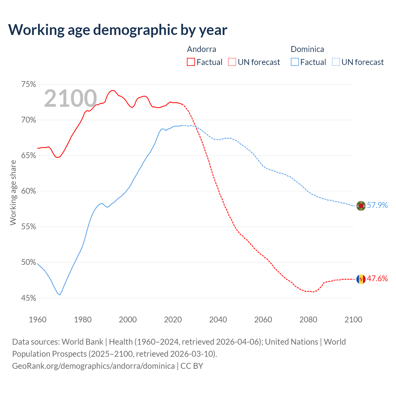 - Andorra has 60.7K working age adults (aged 15-64) vs 45.3K in Dominica.