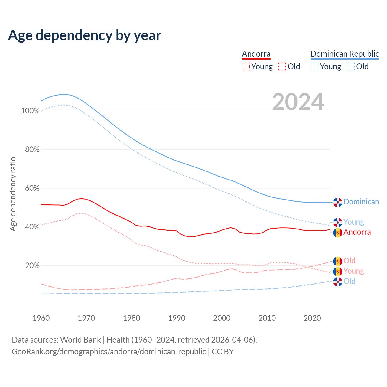 - Andorra is ranked 18/196 by median age (oldest to youngest) vs 112/196 for the Dominican Republic.