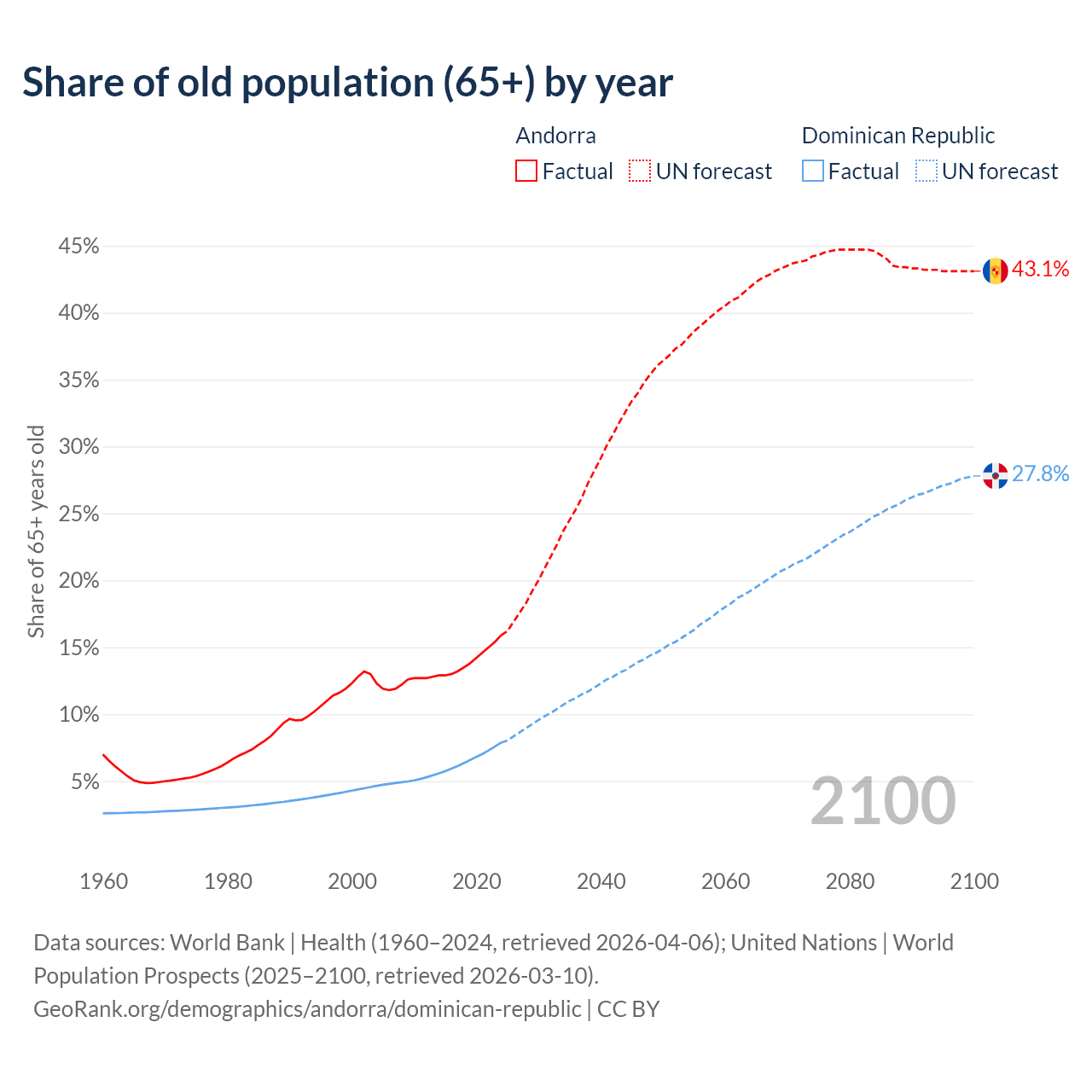 The share of older people aged 65 and over is 15.9% in Andorra and 7.88% in the Dominican Republic. Life expectancy in Andorra compared to the Dominican Republic .