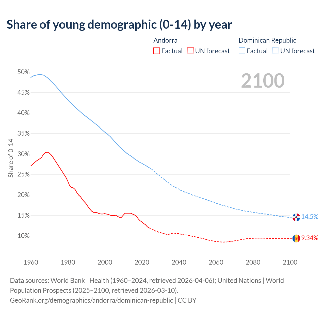 - The share of young demographic (0-15 years old) in Andorra is 11.9% vs 26.6% in the Dominican Republic.
