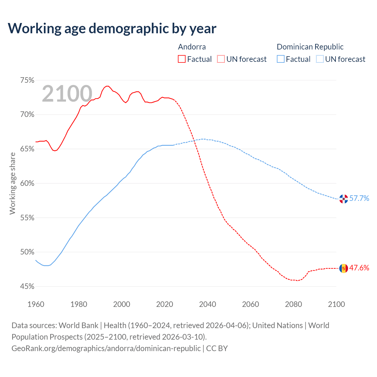 - Andorra has 60.7K working age adults (aged 15-64) vs 7.63M in the Dominican Republic.