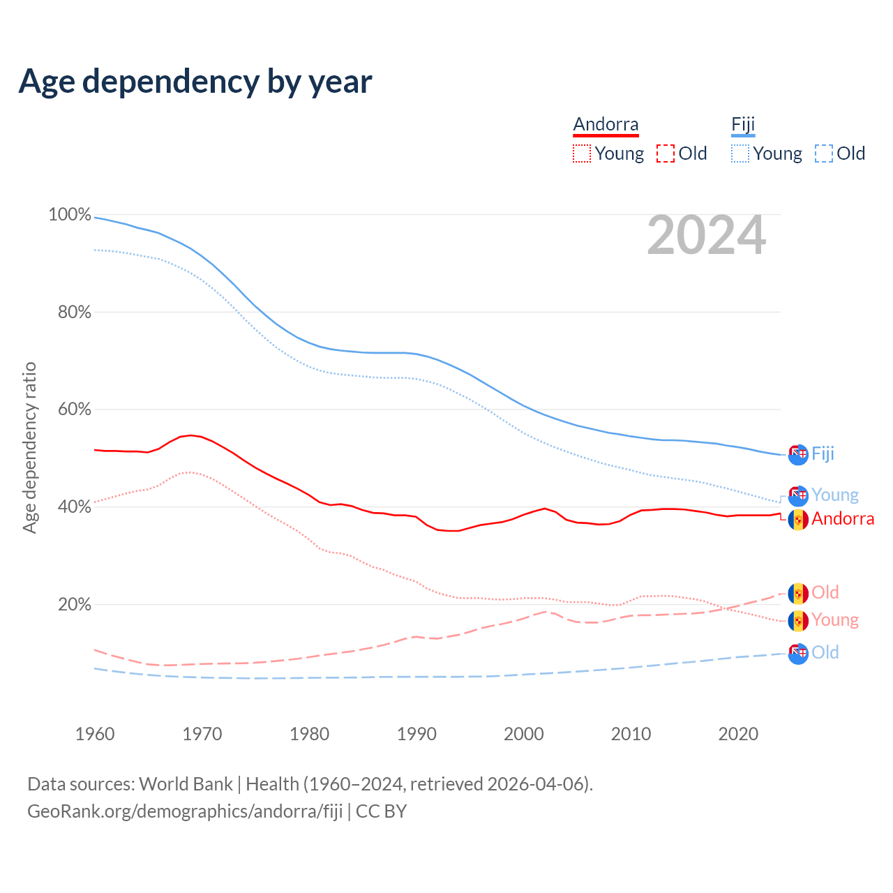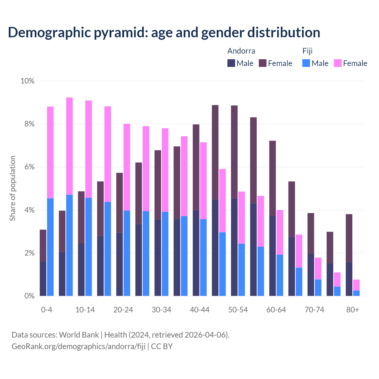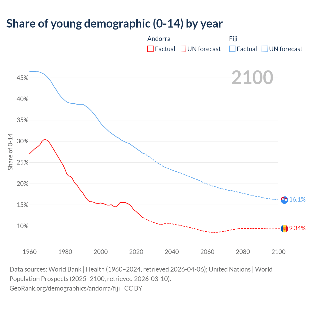 - The share of young demographic (0-15 years old) in Andorra is 11.9% vs 27.1% in Fiji.