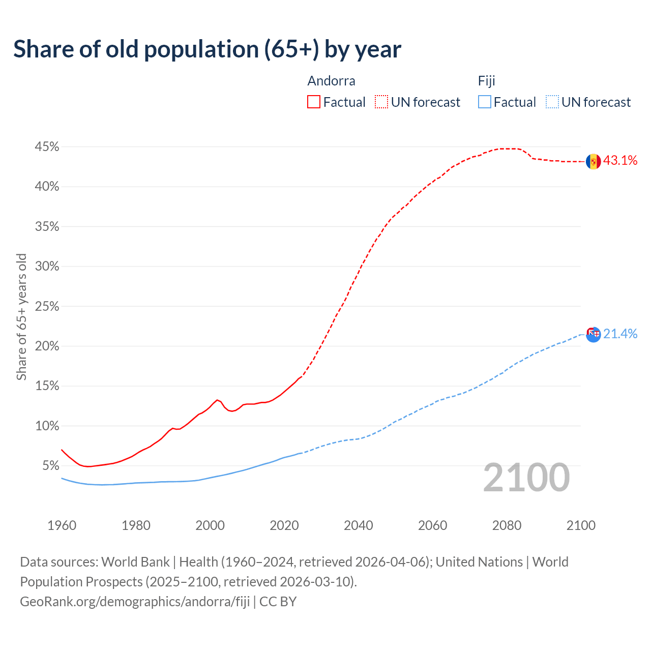 - The share of old-age demographic (65+) in Andorra is 15.9% vs 6.49% in Fiji.