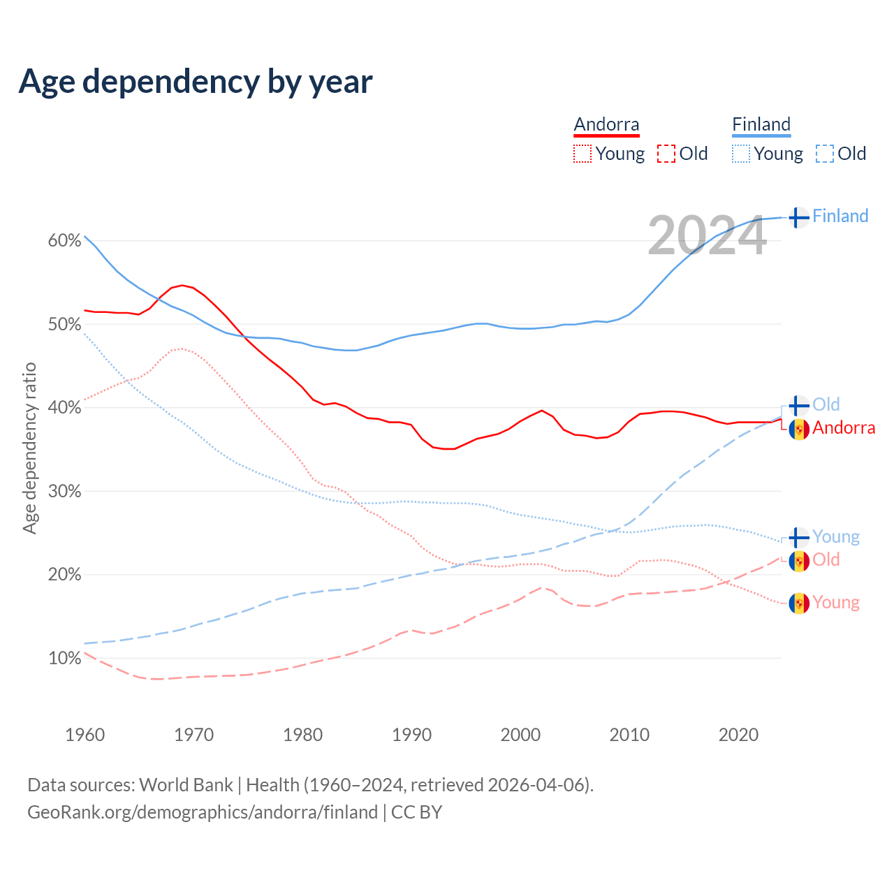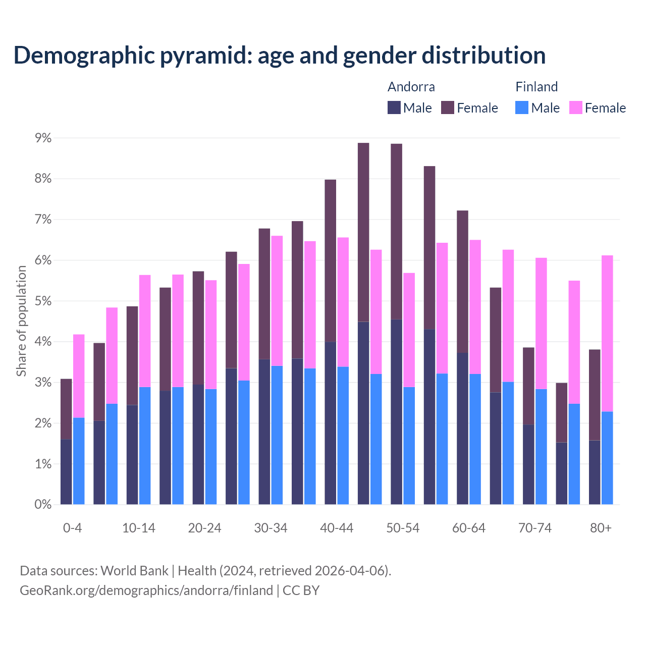 - Andorra is ranked 18/196 by median age (oldest to youngest) vs 22/196 for Finland.