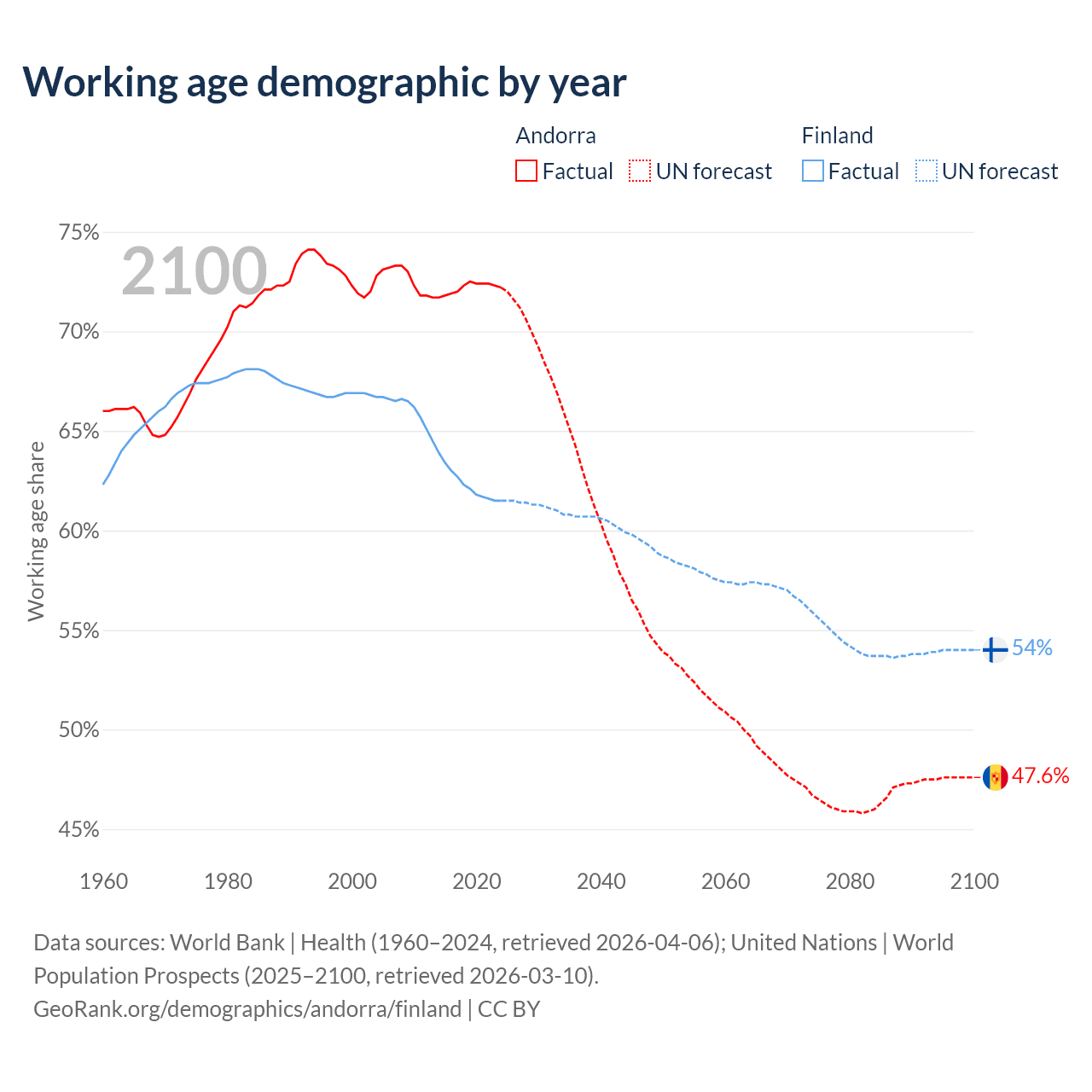 - Andorra has 60.7K working age adults (aged 15-64) vs 3.46M in Finland.