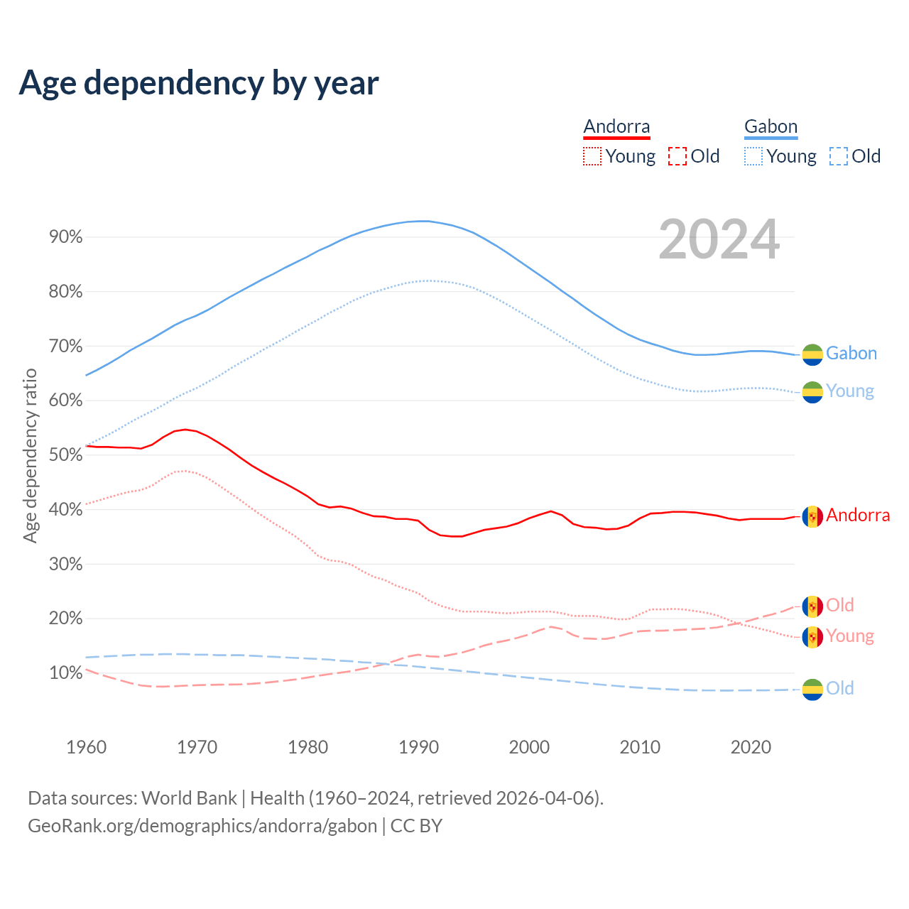 - The share of old-age demographic (65+) in Andorra is 15.9% vs 4.08% in Gabon.