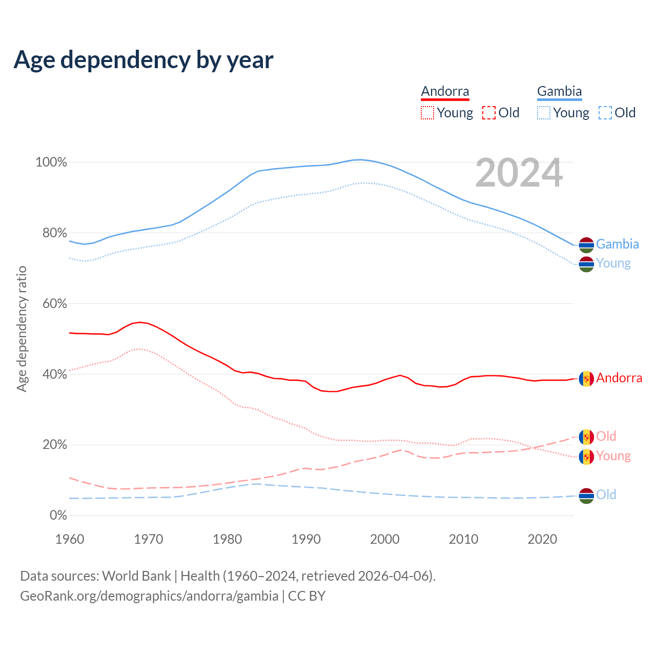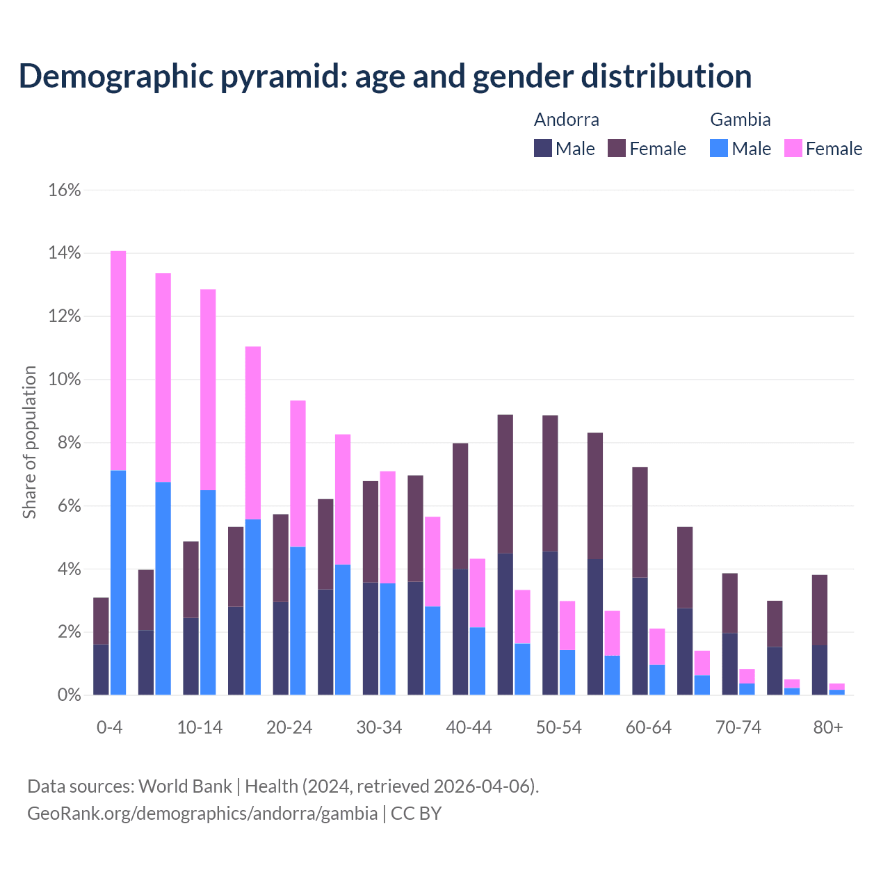 The share of older people aged 65 and over is 15.9% in Andorra and 3.08% in the Gambia. Life expectancy in Andorra compared to the Gambia .