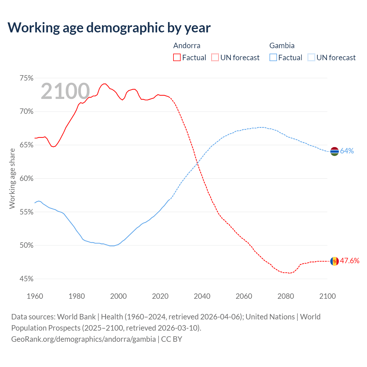- Andorra has 60.7K working age adults (aged 15-64) vs 1.64M in the Gambia.