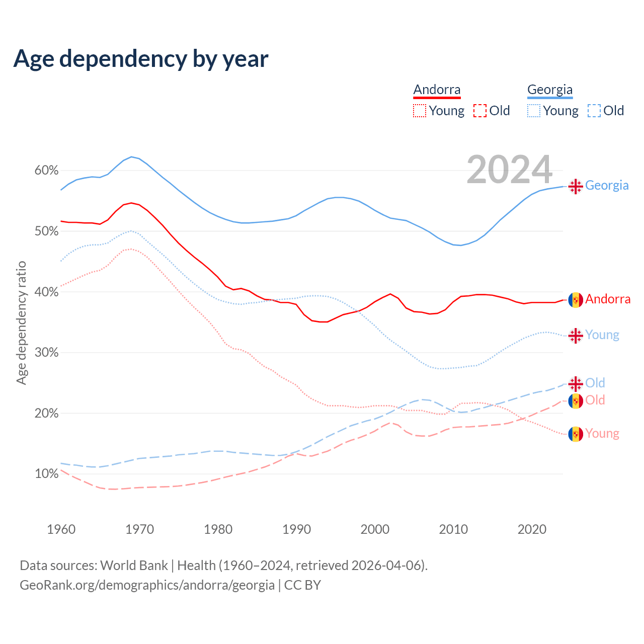 - The share of old-age demographic (65+) in Andorra is 15.9% vs 15.6% in Georgia.