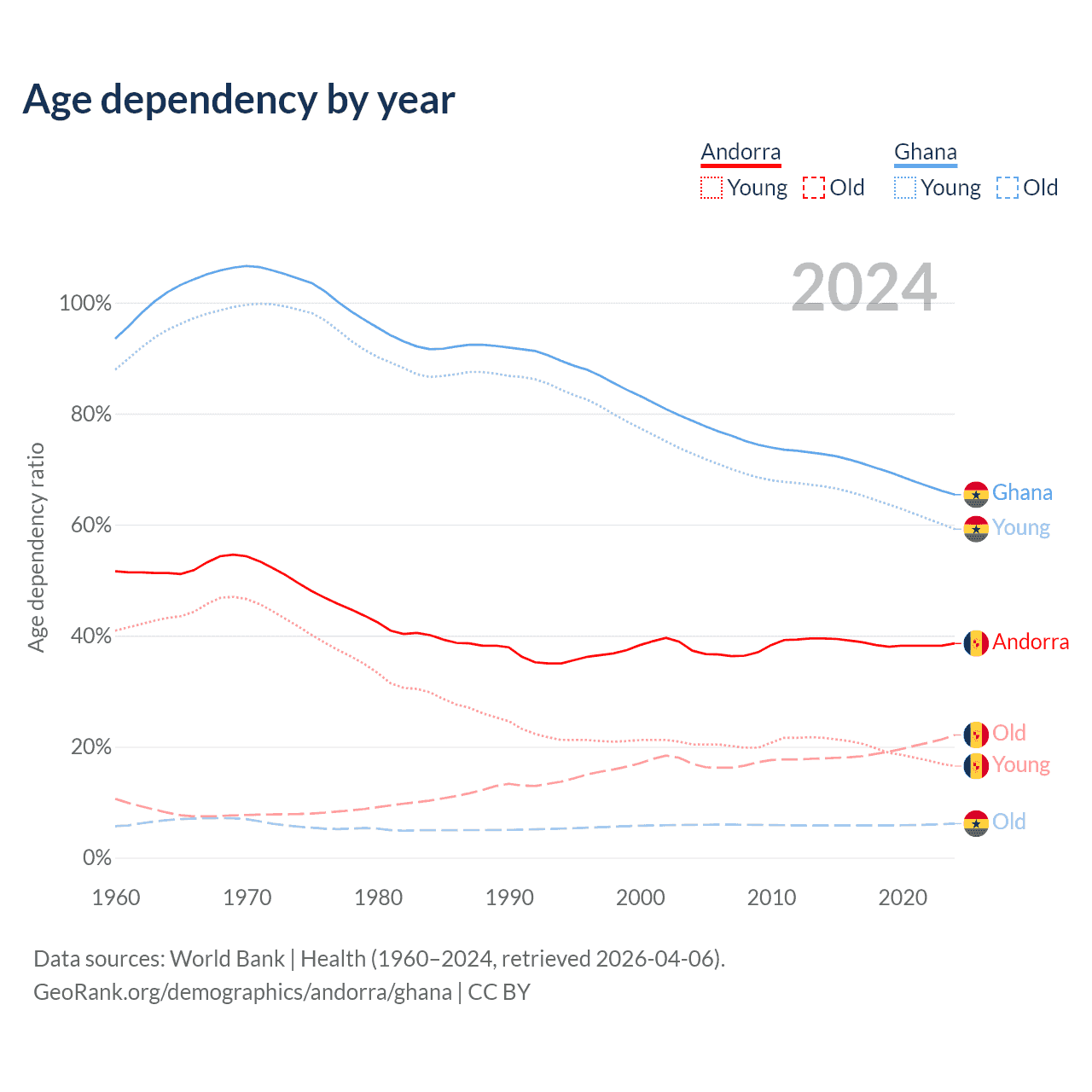 - Andorra is ranked 18/196 by median age (oldest to youngest) vs 146/196 for Ghana.