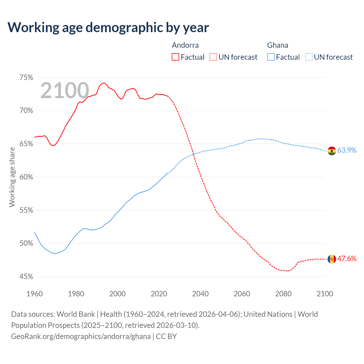 - Andorra has 60.7K working age adults (aged 15-64) vs 21.7M in Ghana.