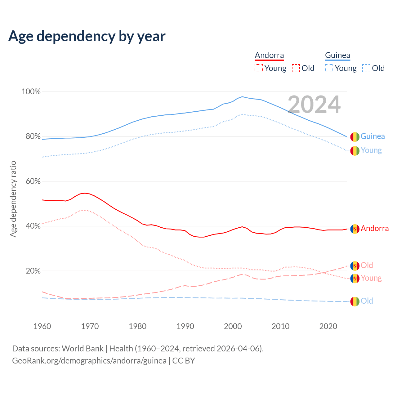 - Andorra is ranked 18/196 by median age (oldest to youngest) vs 176/196 for Guinea.