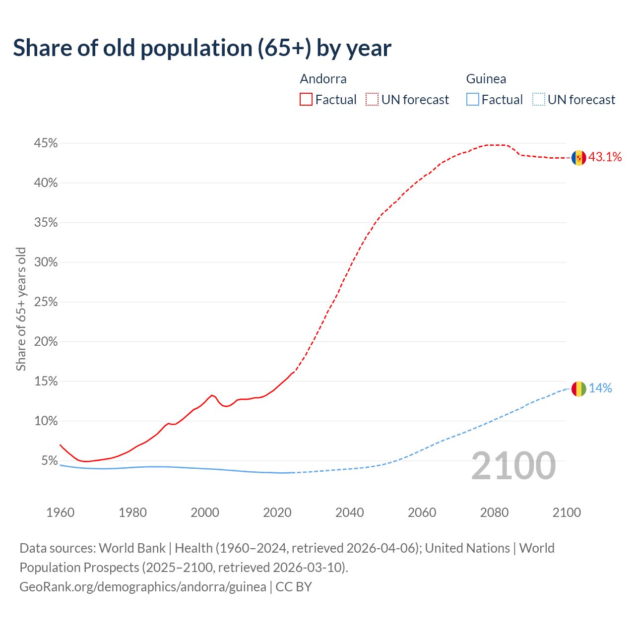 Median age Andorra vs Guinea, 1960-2100