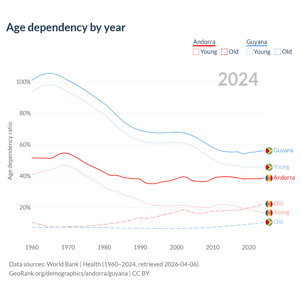 - Andorra is ranked 18/196 by median age (oldest to youngest) vs 122/196 for Guyana.