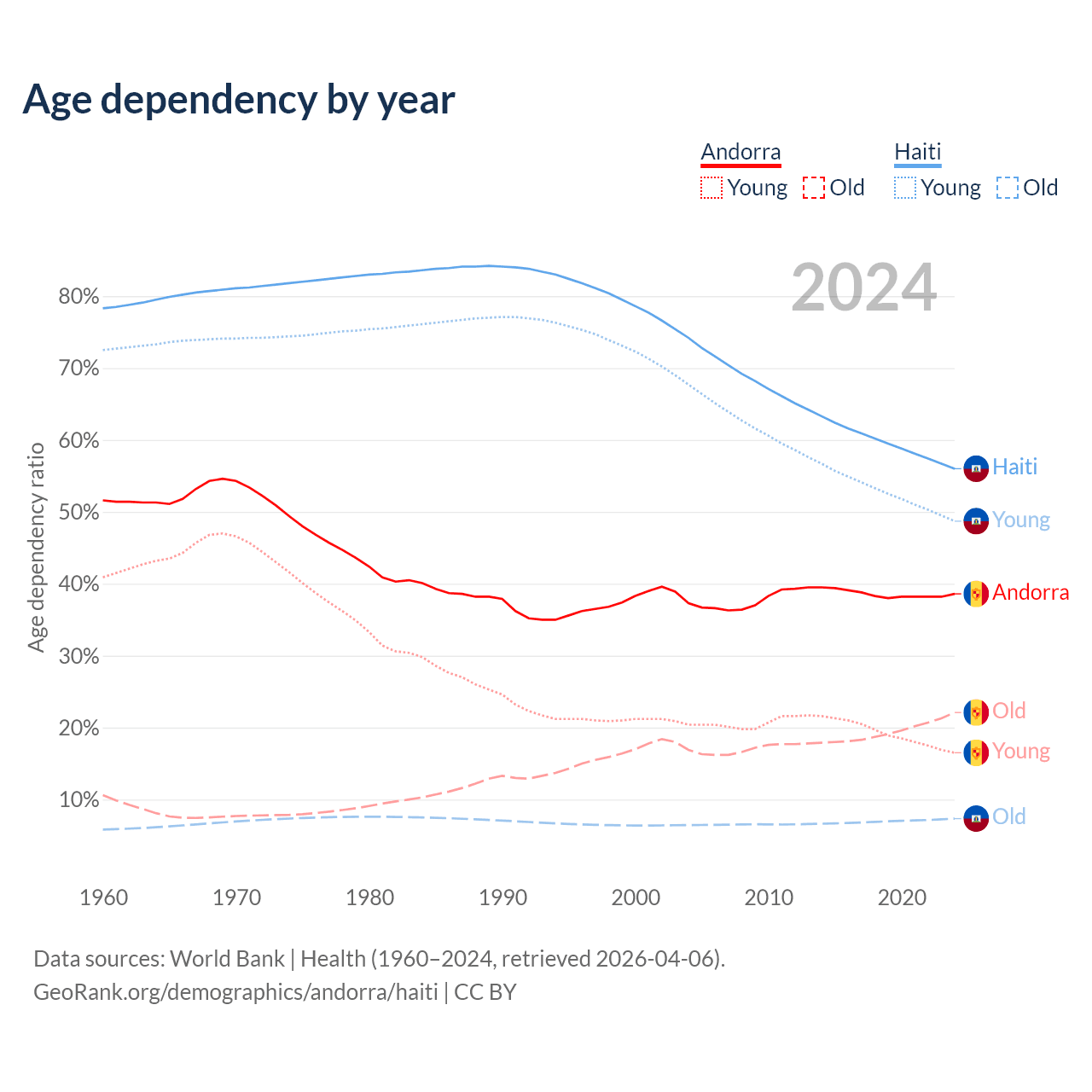 - Andorra is ranked 18/196 by median age (oldest to youngest) vs 135/196 for Haiti.