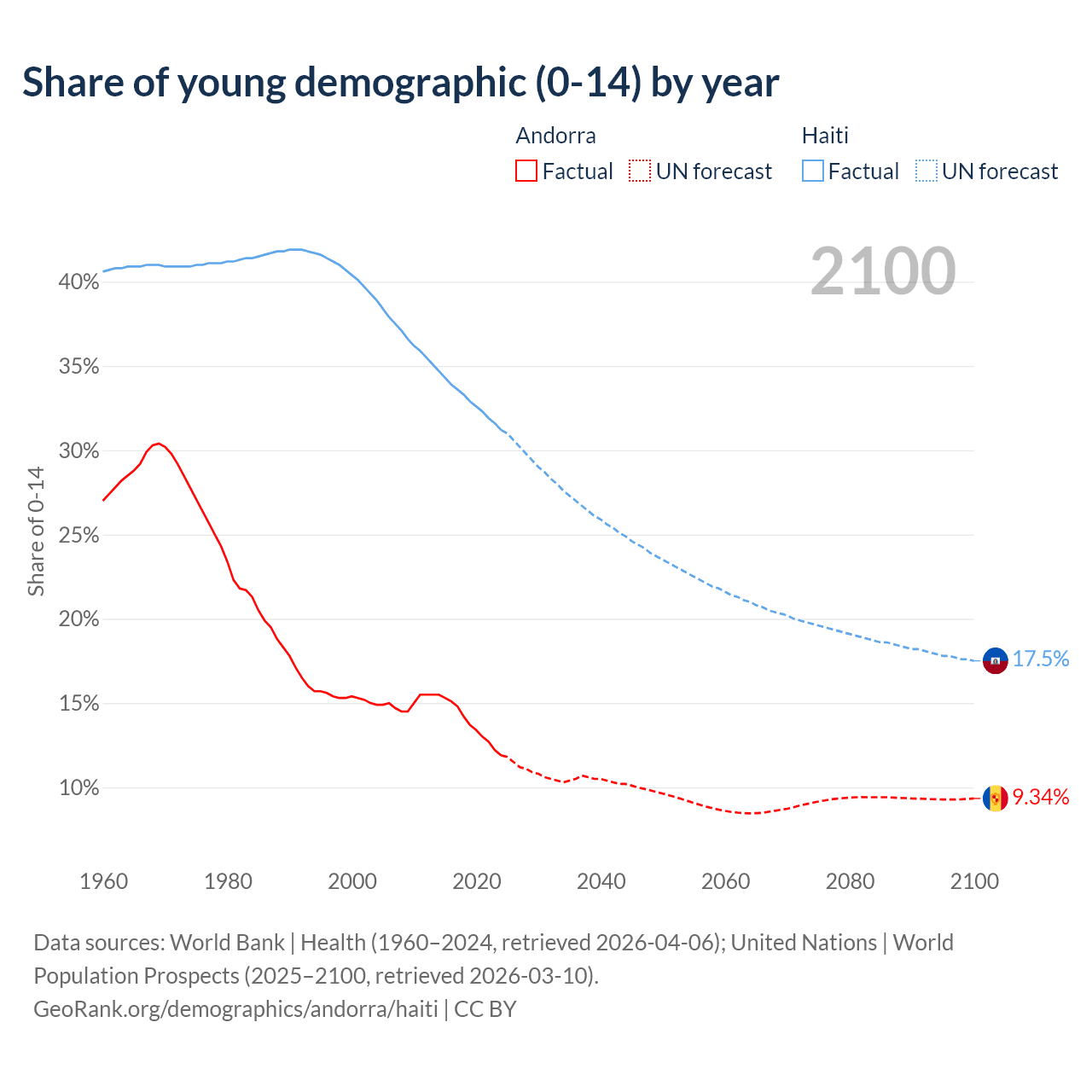 - The share of young demographic (0-15 years old) in Andorra is 11.9% vs 31.2% in Haiti.