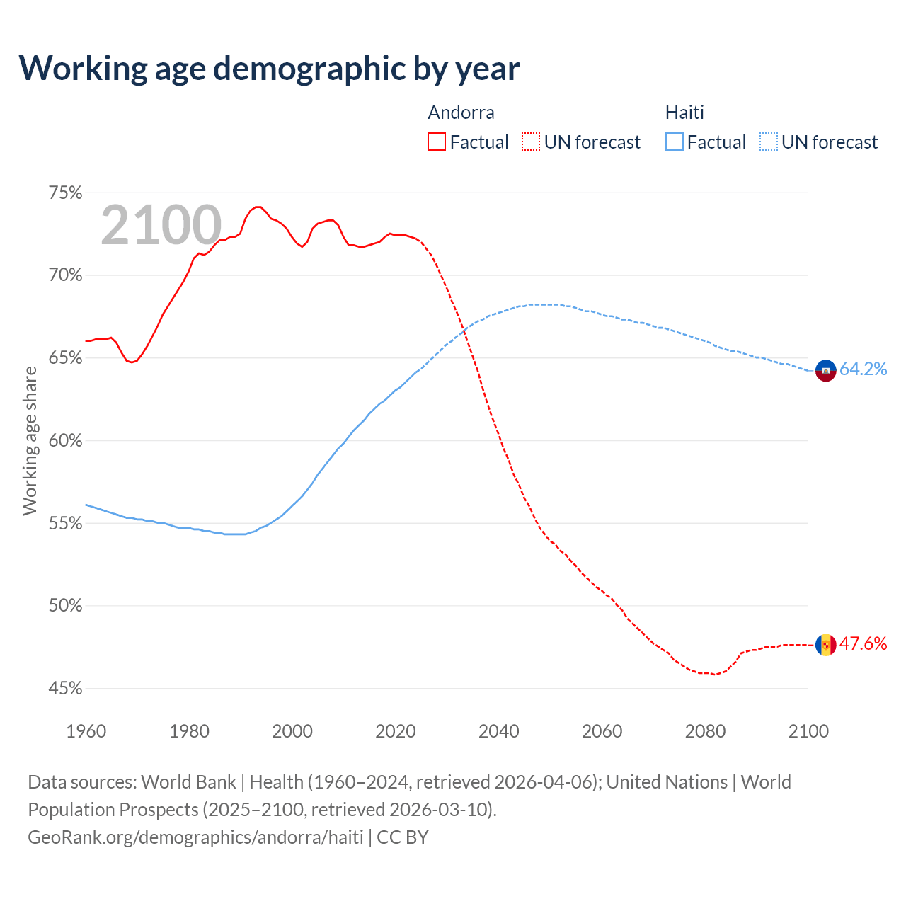 - Andorra has 60.7K working age adults (aged 15-64) vs 7.74M in Haiti.