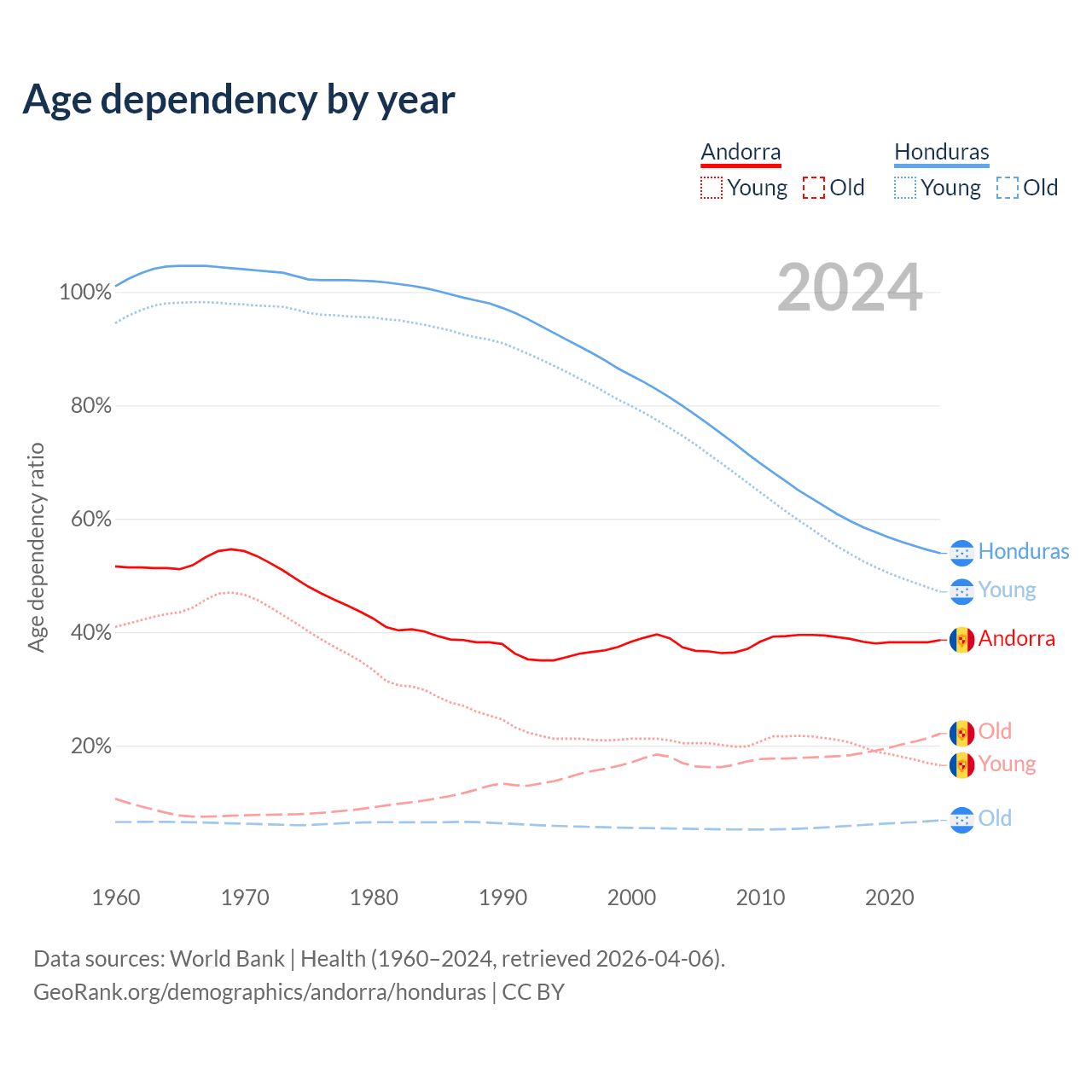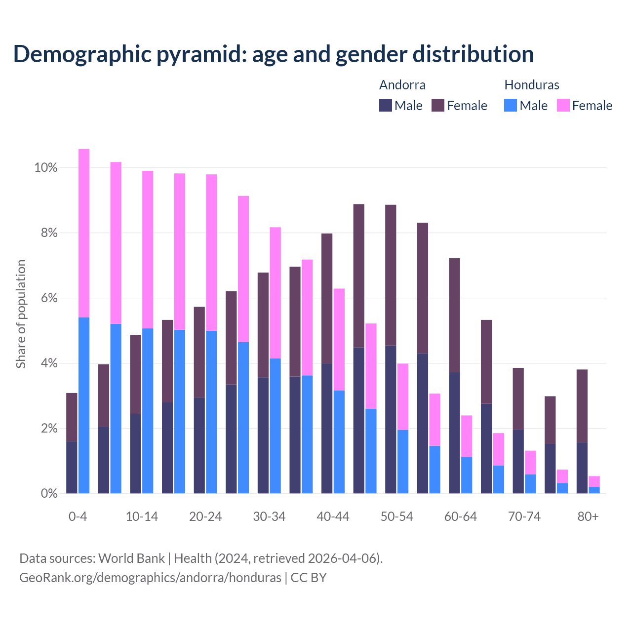- Andorra is ranked 18/196 by median age (oldest to youngest) vs 134/196 for Honduras.