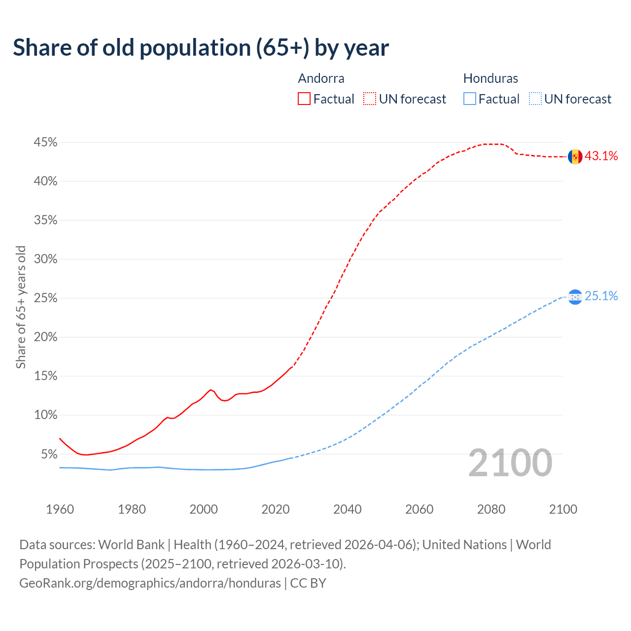 The share of older people aged 65 and over is 15.9% in Andorra and 4.42% in Honduras. Life expectancy in Andorra compared to Honduras .
