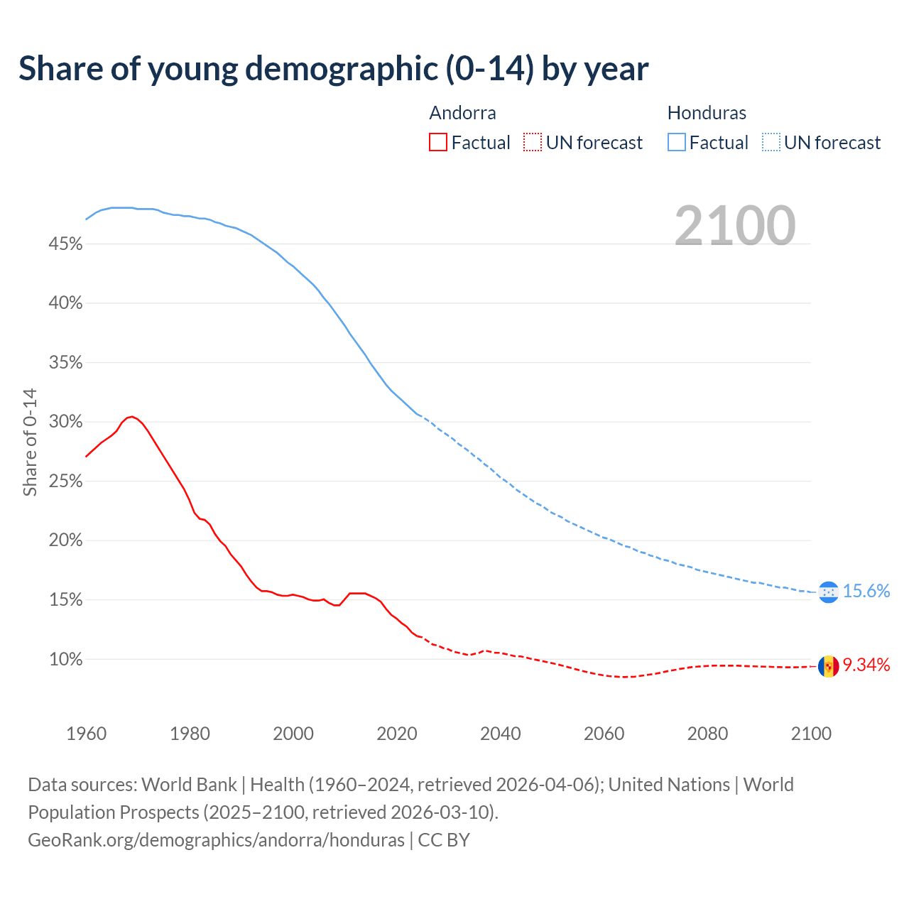 - The share of young demographic (0-15 years old) in Andorra is 11.9% vs 30.6% in Honduras.