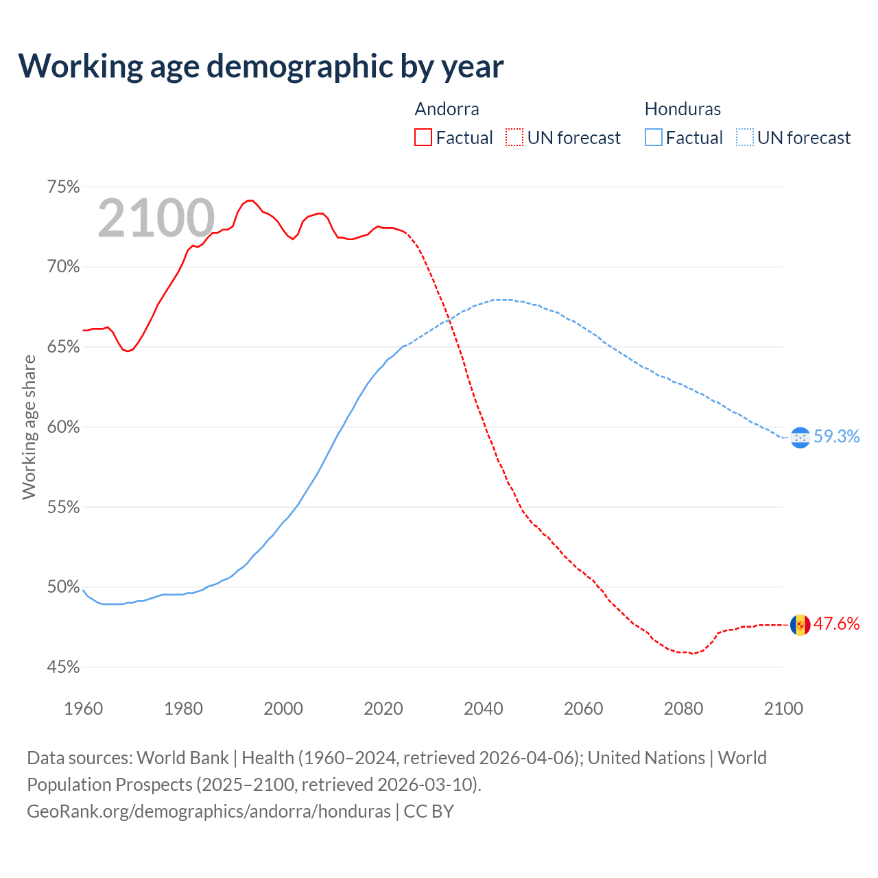 - Andorra has 60.7K working age adults (aged 15-64) vs 7.3M in Honduras.