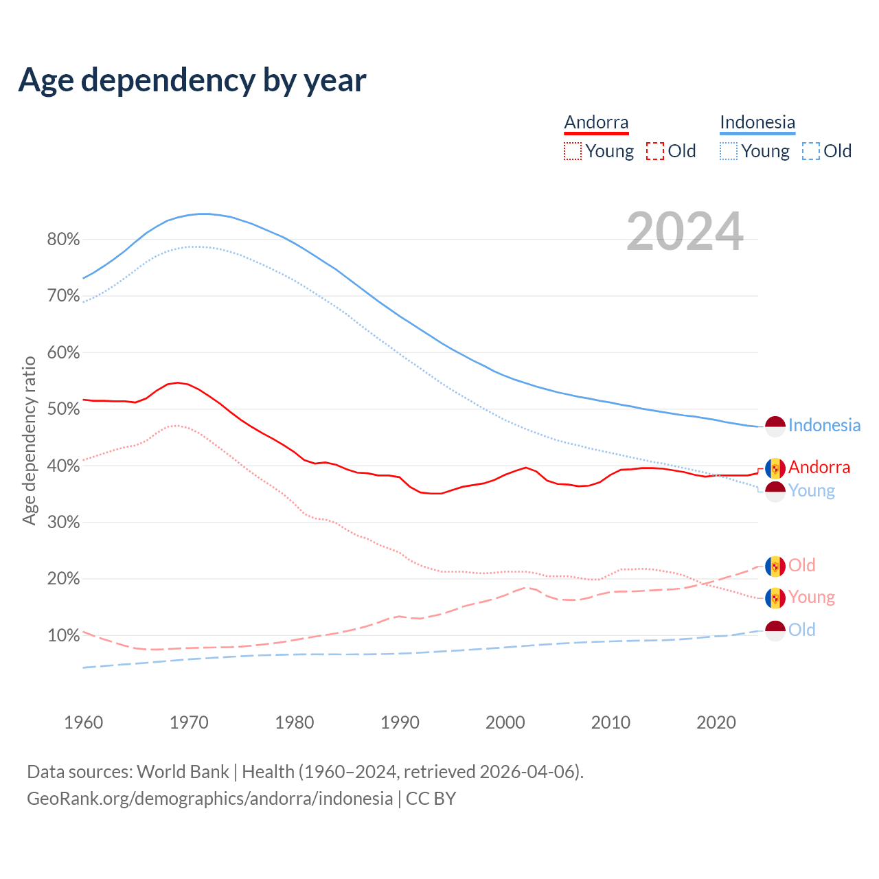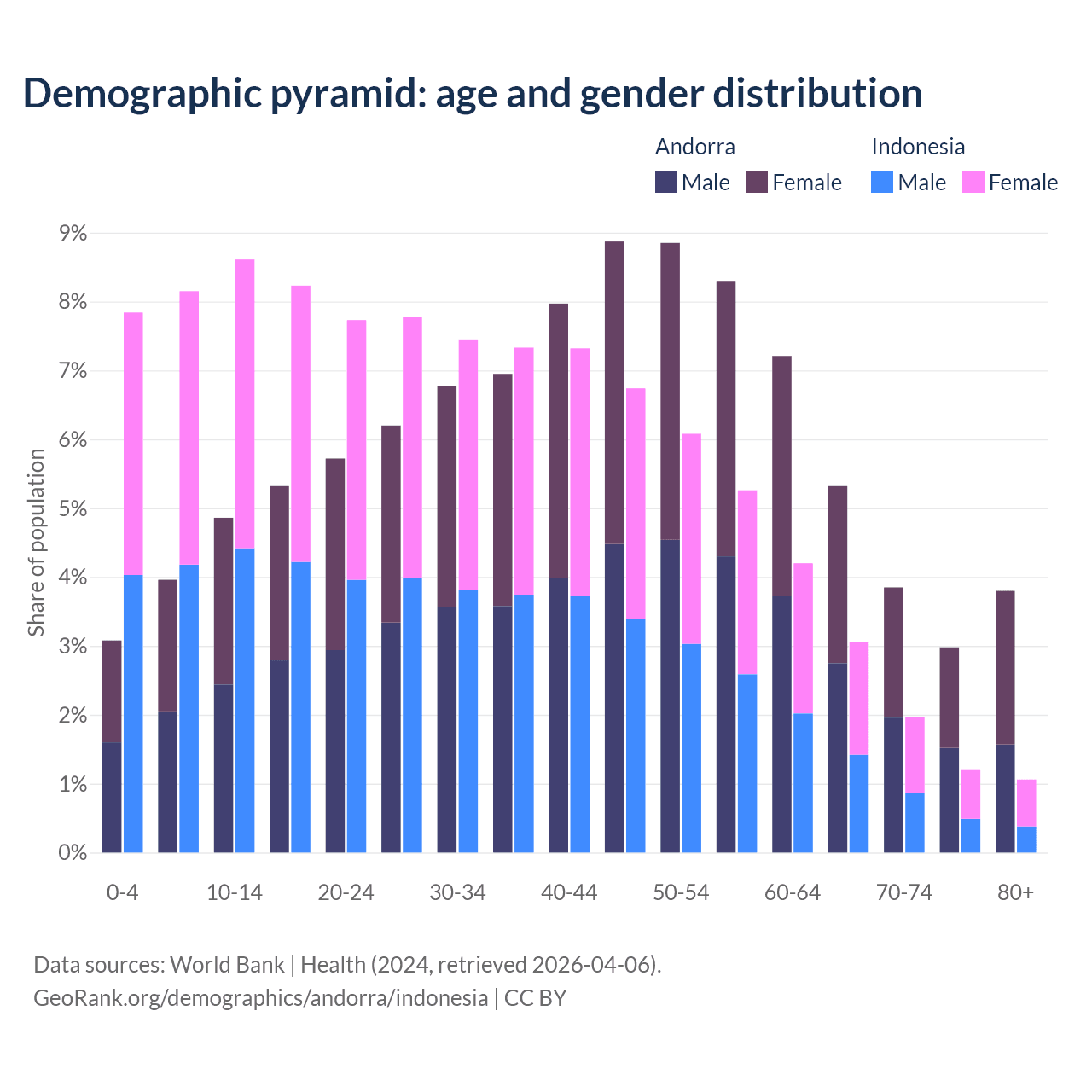 - Andorra is ranked 18/196 by median age (oldest to youngest) vs 93/196 for Indonesia.