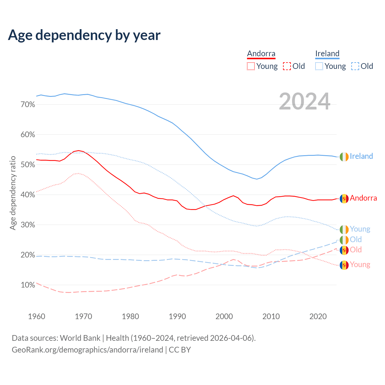 - Andorra is ranked 18/196 by median age (oldest to youngest) vs 48/196 for Ireland.