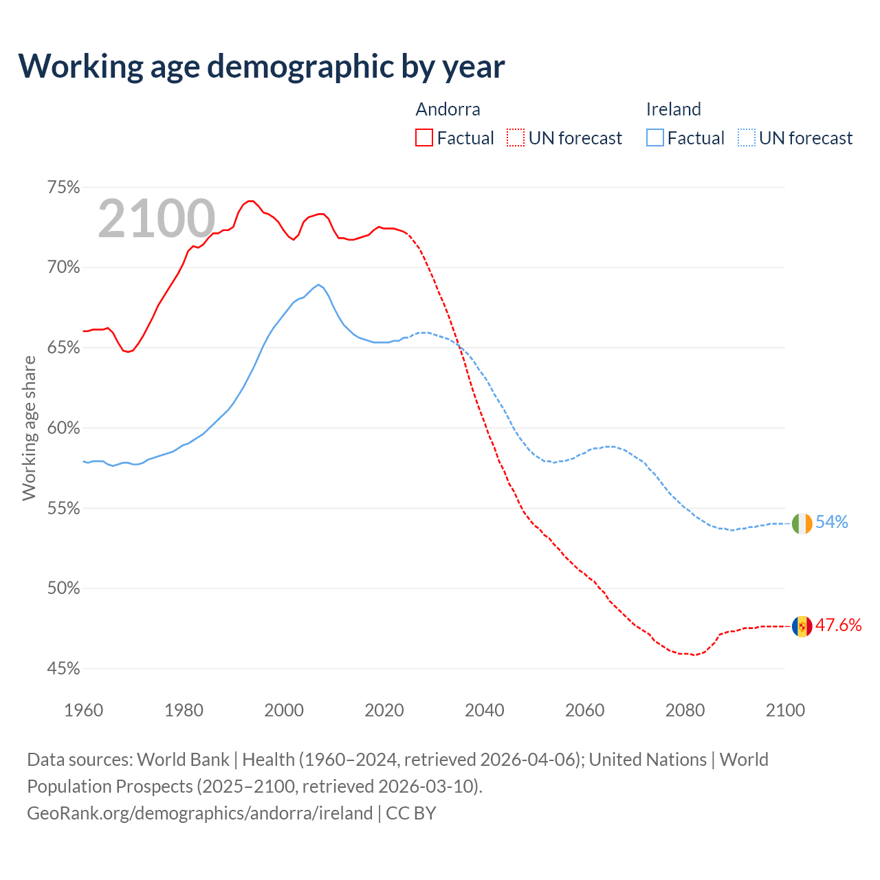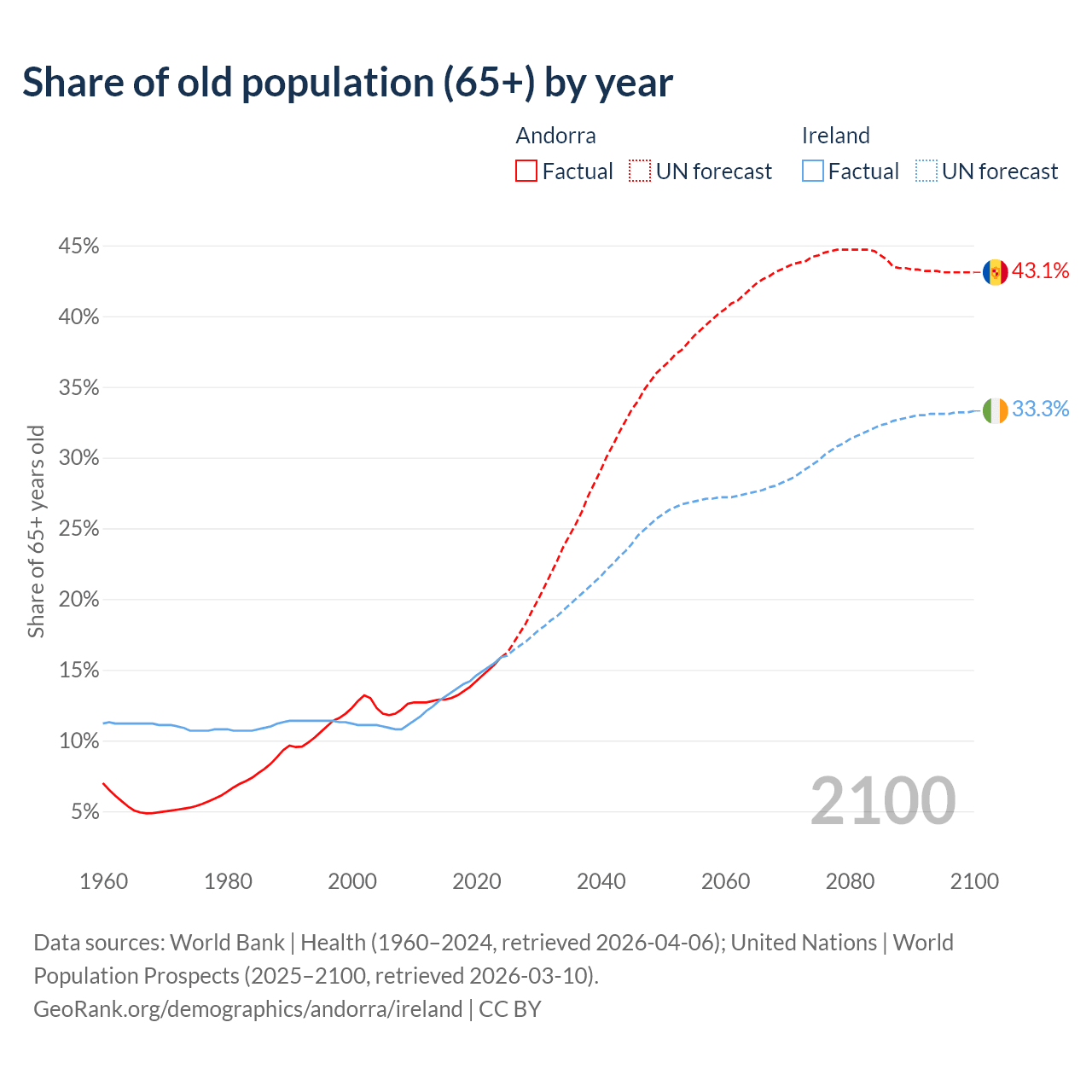 Median age Andorra vs Ireland, 1960-2100
