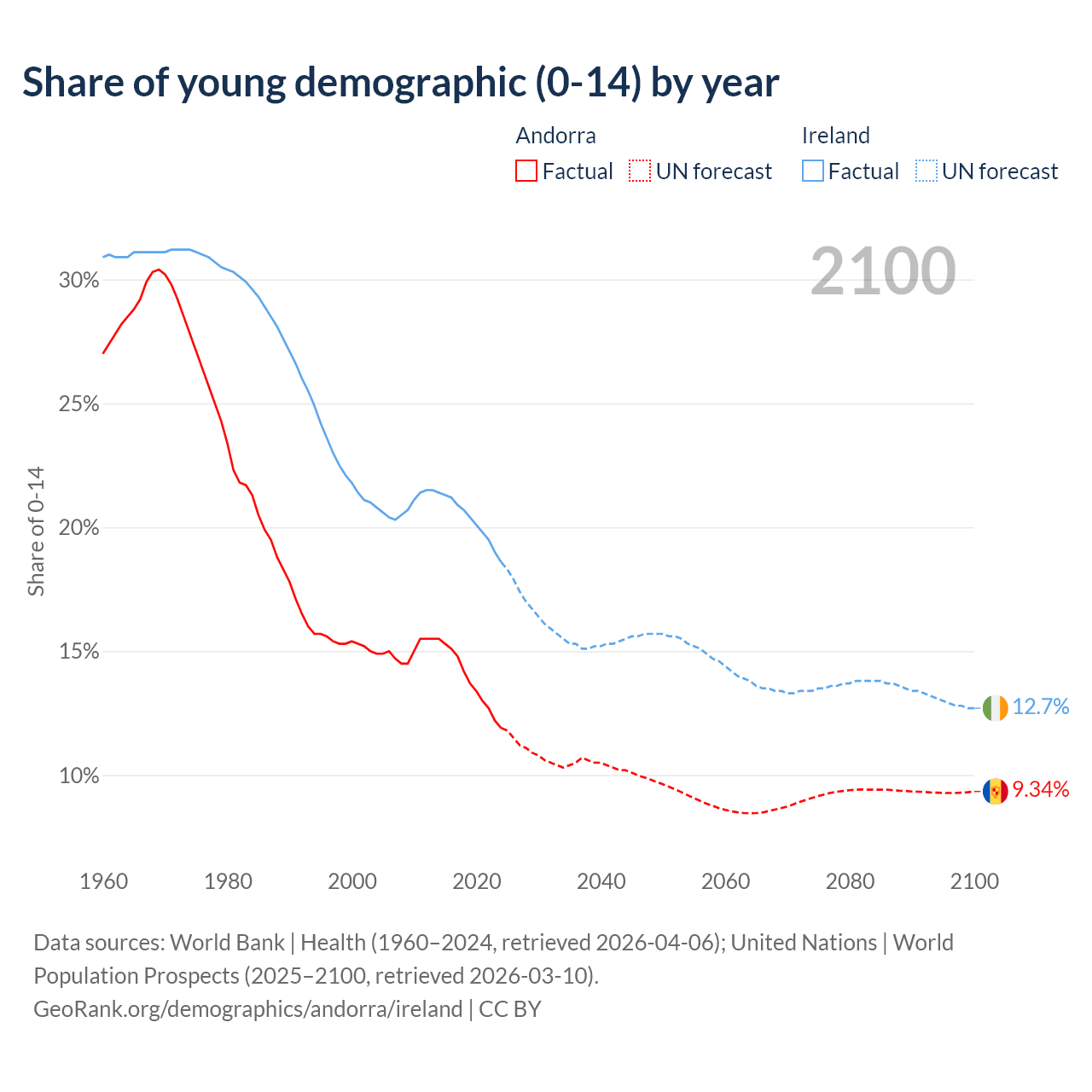 - The share of young demographic (0-15 years old) in Andorra is 11.9% vs 18.6% in Ireland.