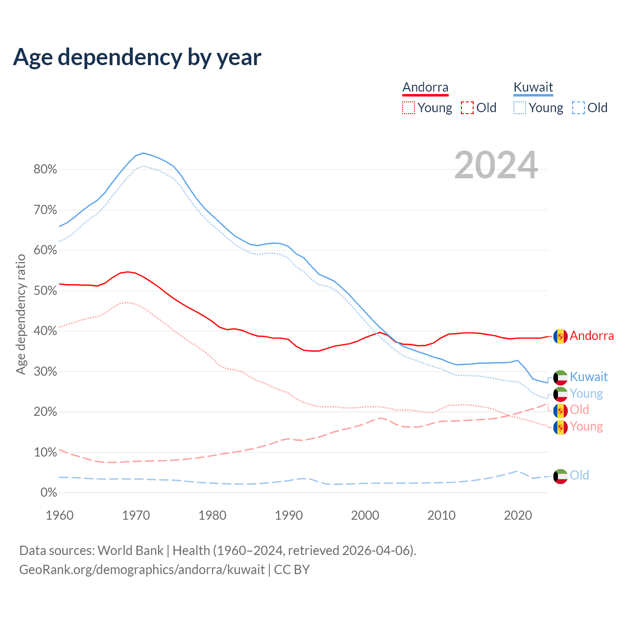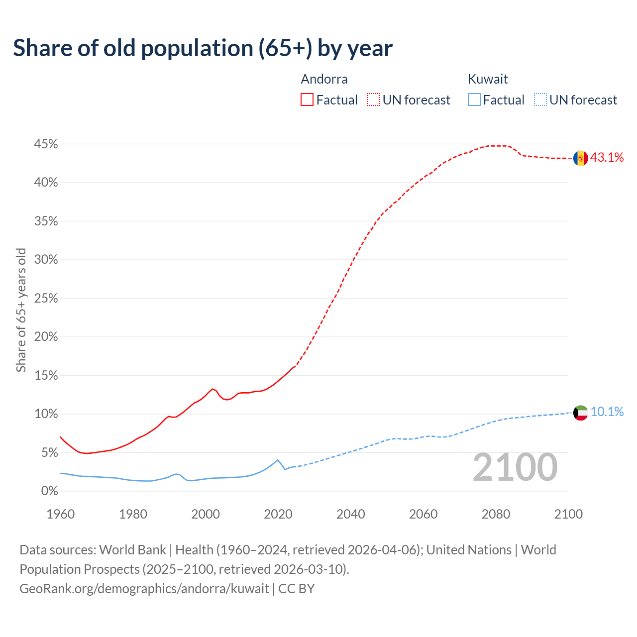 The share of older people aged 65 and over is 15.9% in Andorra and 3.1% in Kuwait. Life expectancy in Andorra compared to Kuwait .