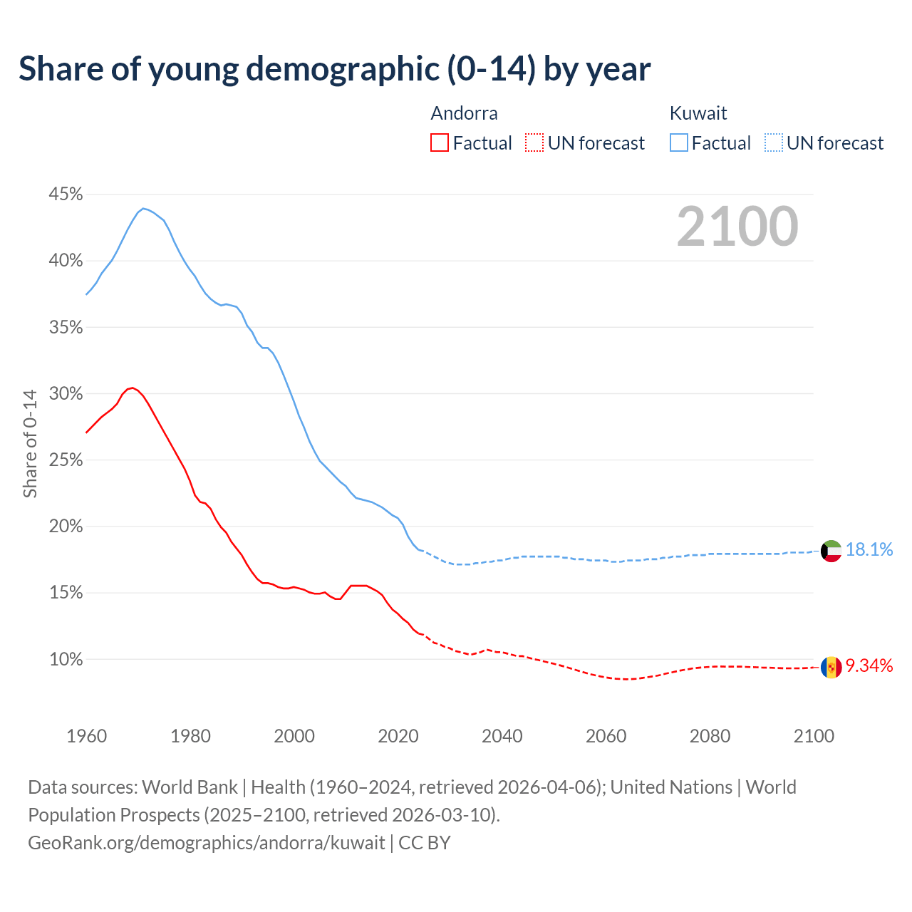 - The share of young demographic (0-15 years old) in Andorra is 11.9% vs 18.2% in Kuwait.