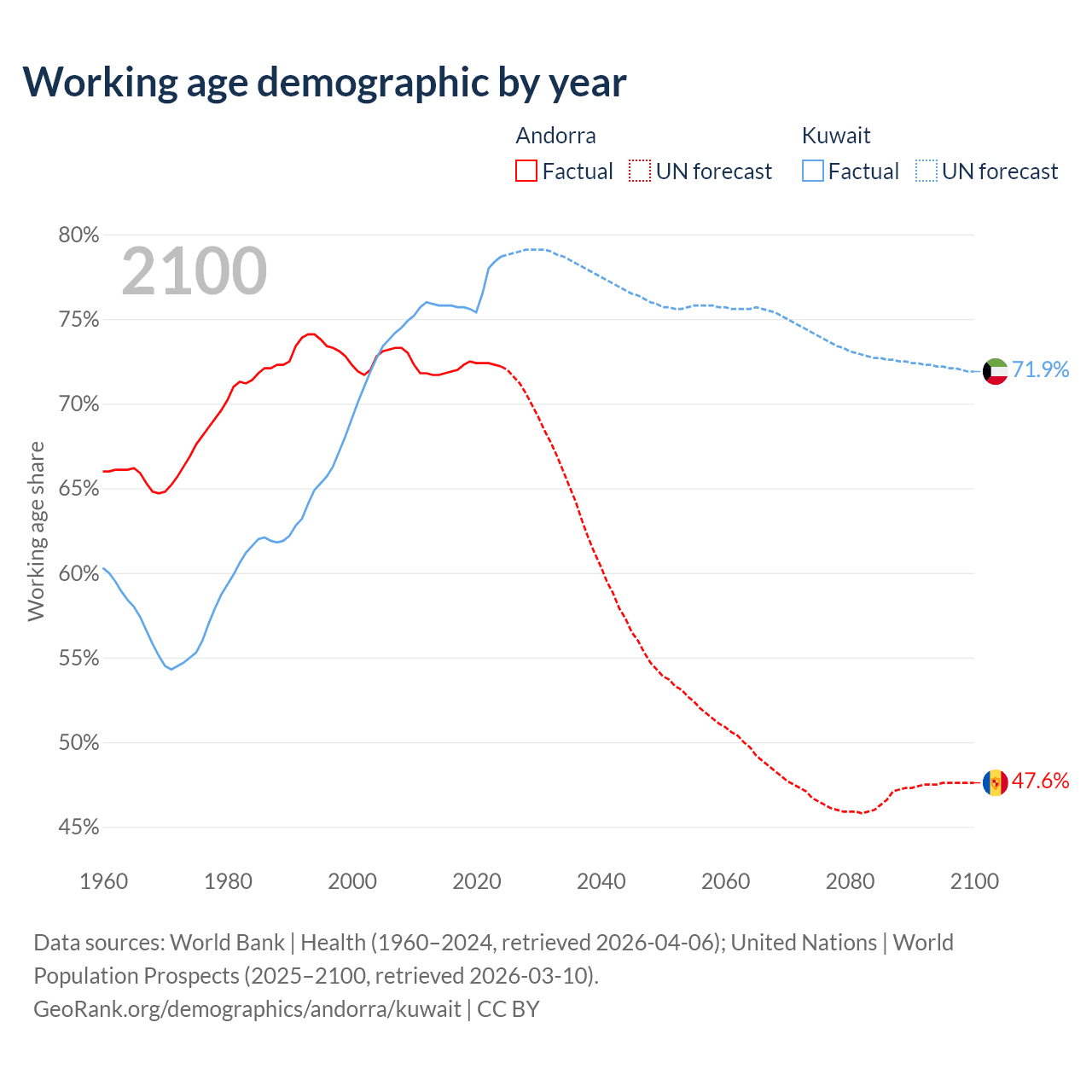 Median age Andorra vs Kuwait, 1960-2100