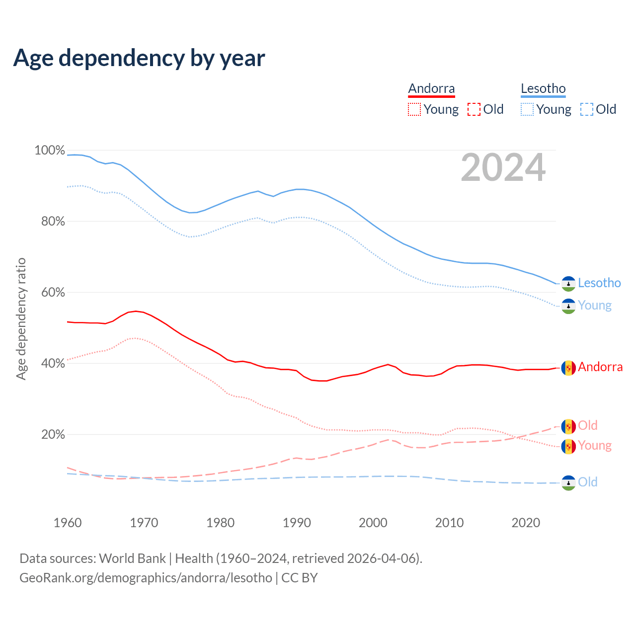 - The share of old-age demographic (65+) in Andorra is 15.9% vs 3.86% in Lesotho.