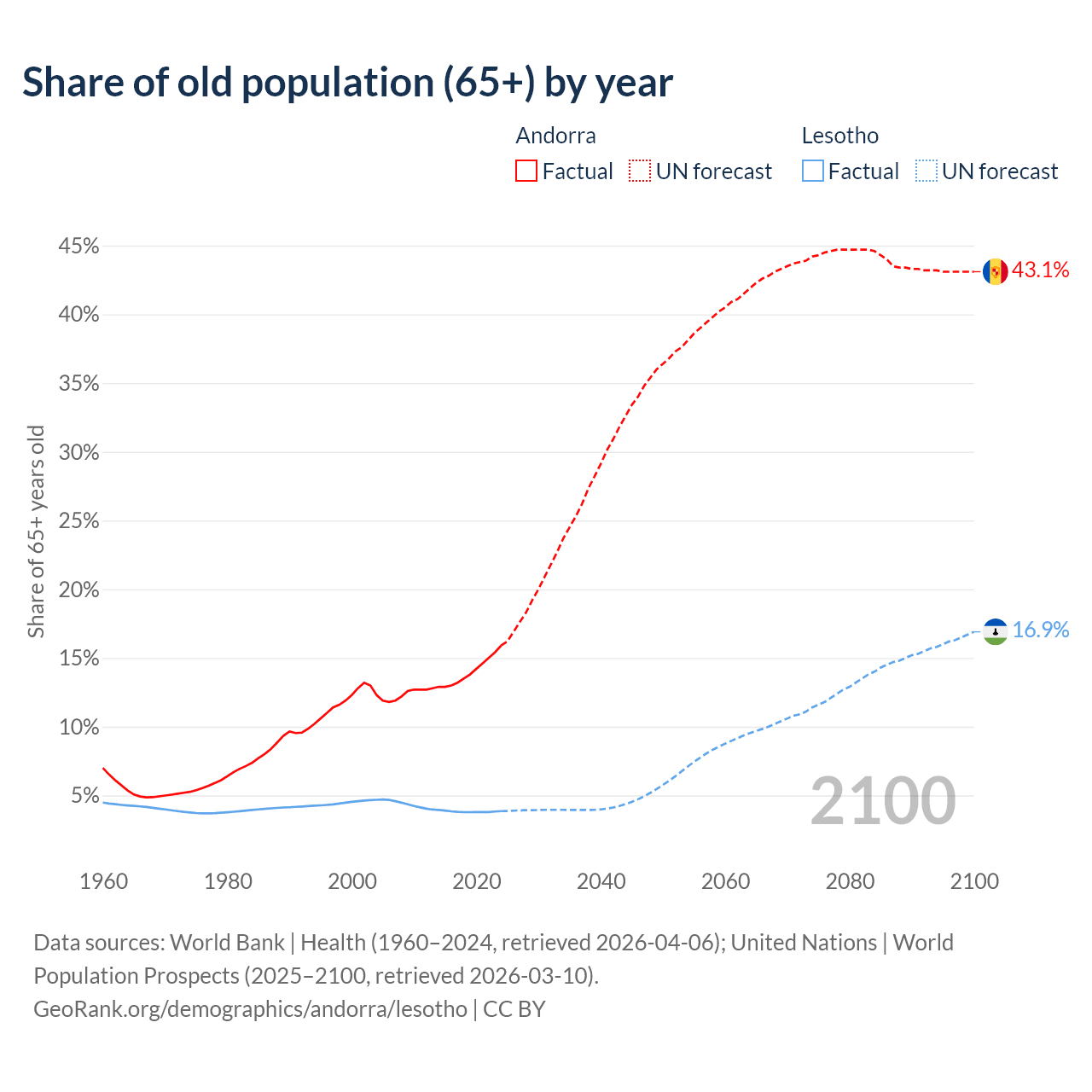 The share of older people aged 65 and over is 15.9% in Andorra and 3.86% in Lesotho. Life expectancy in Andorra compared to Lesotho .