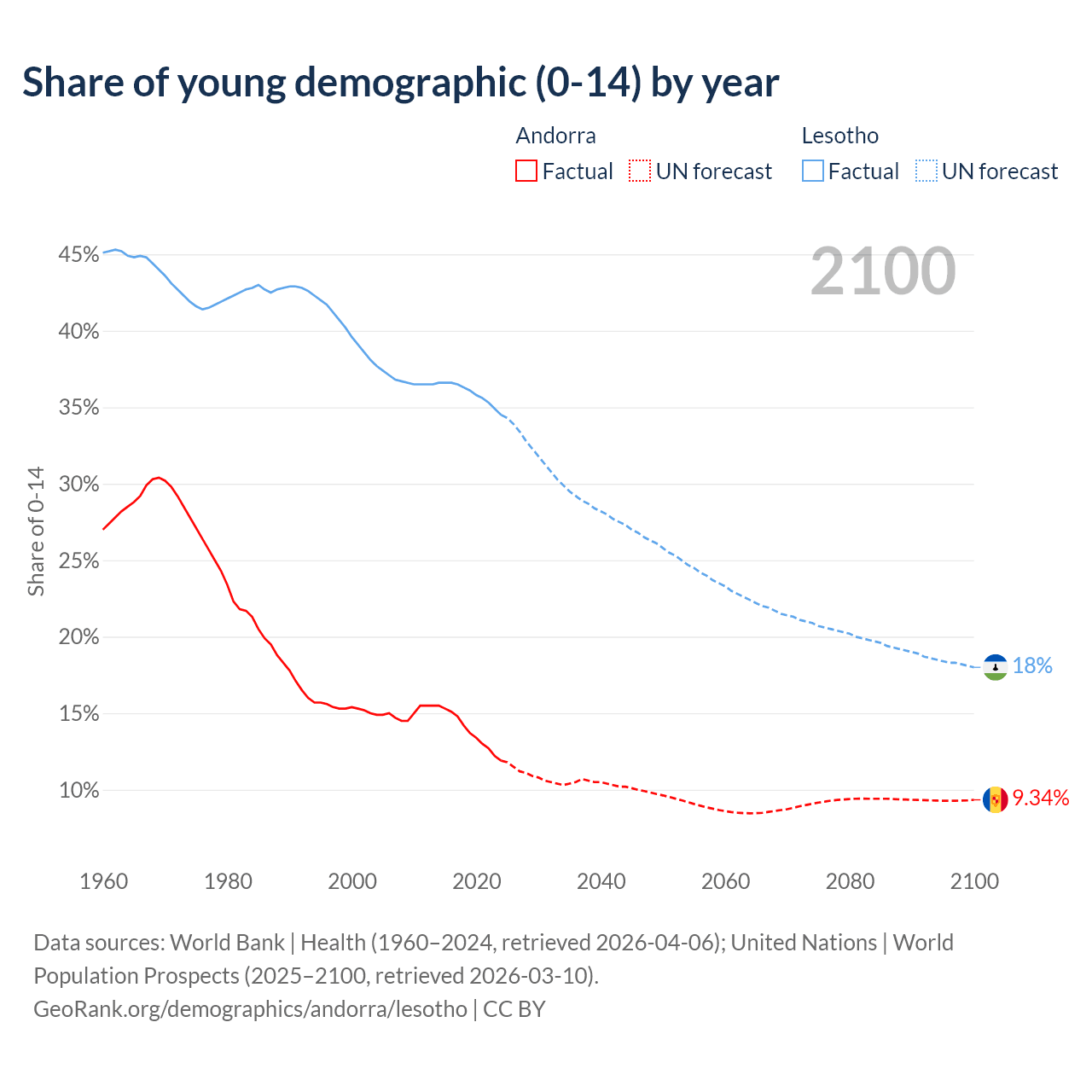 - The share of young demographic (0-15 years old) in Andorra is 11.9% vs 34.5% in Lesotho.