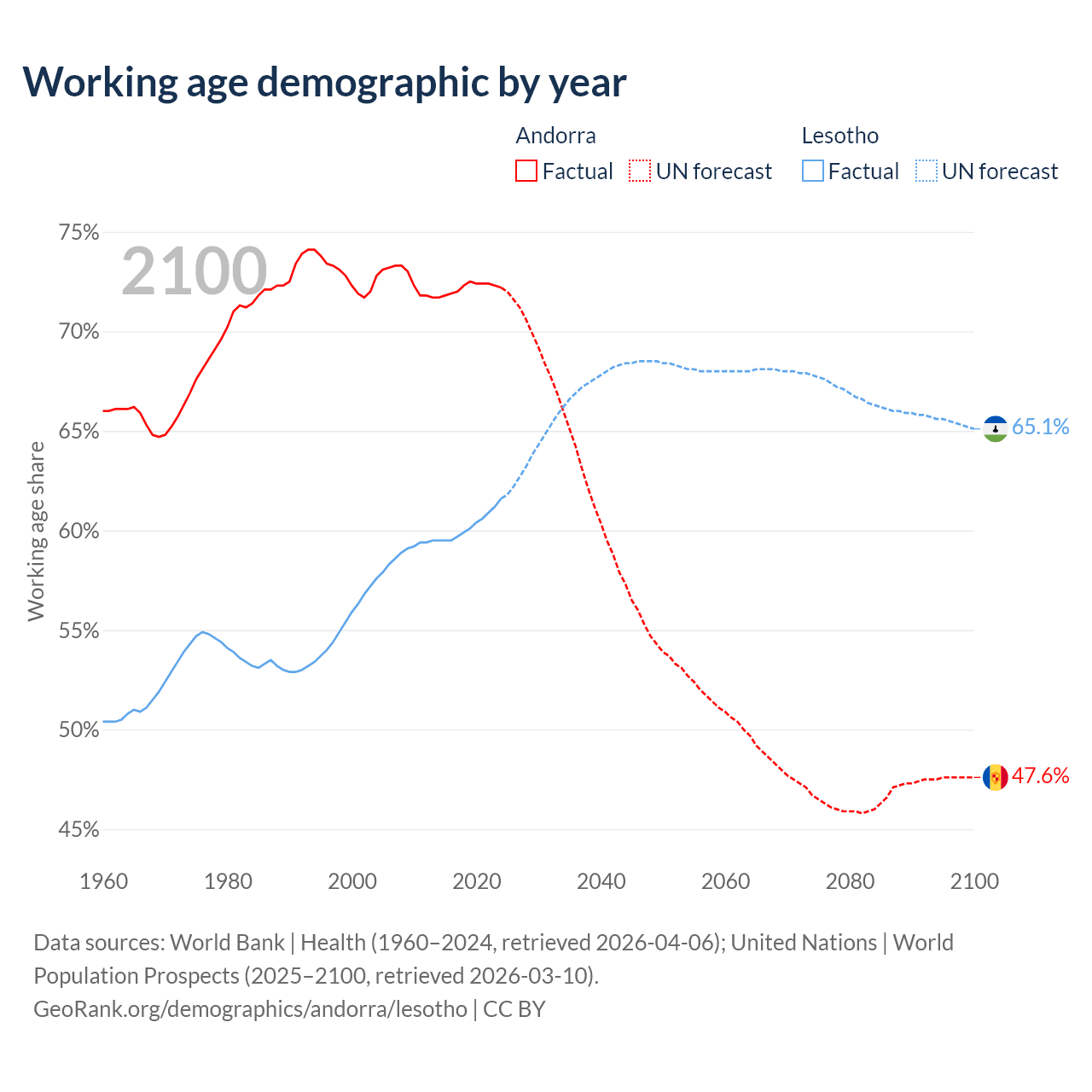Median age Andorra vs Lesotho, 1960-2100