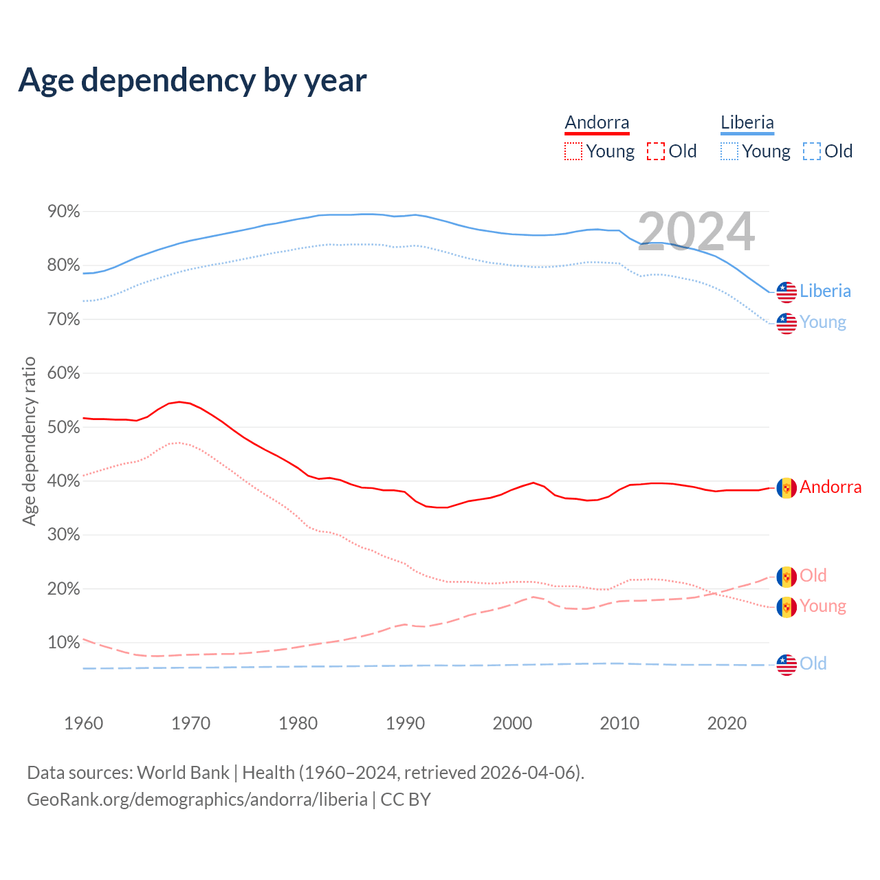 - Andorra is ranked 18/196 by median age (oldest to youngest) vs 169/196 for Liberia.