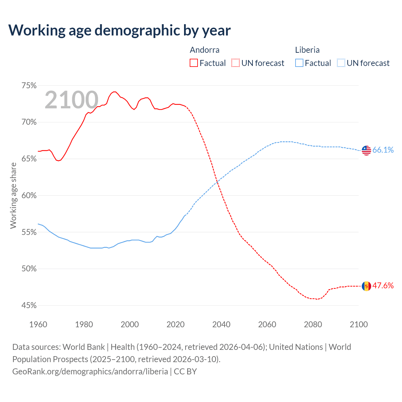 - Andorra has 60.7K working age adults (aged 15-64) vs 3.37M in Liberia.