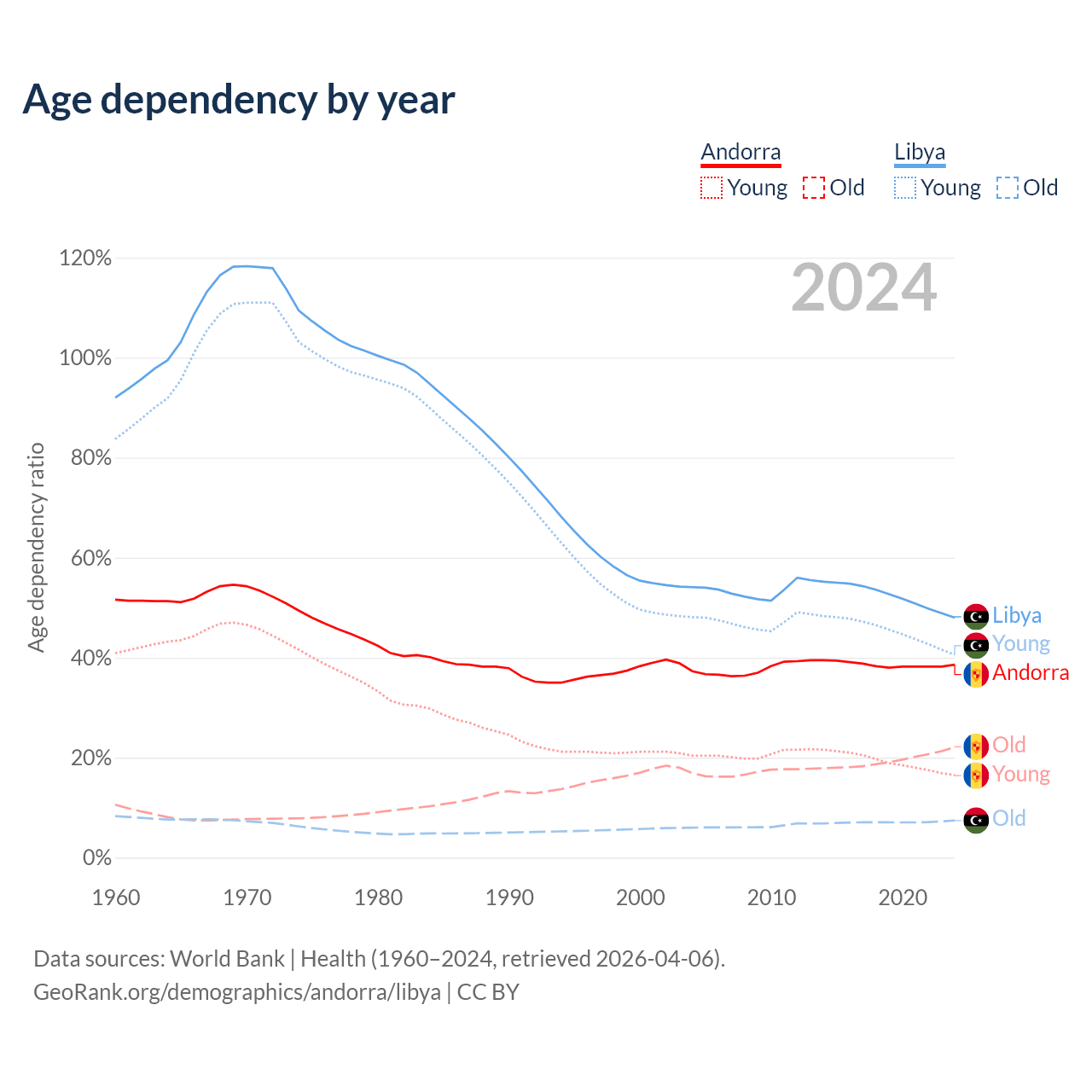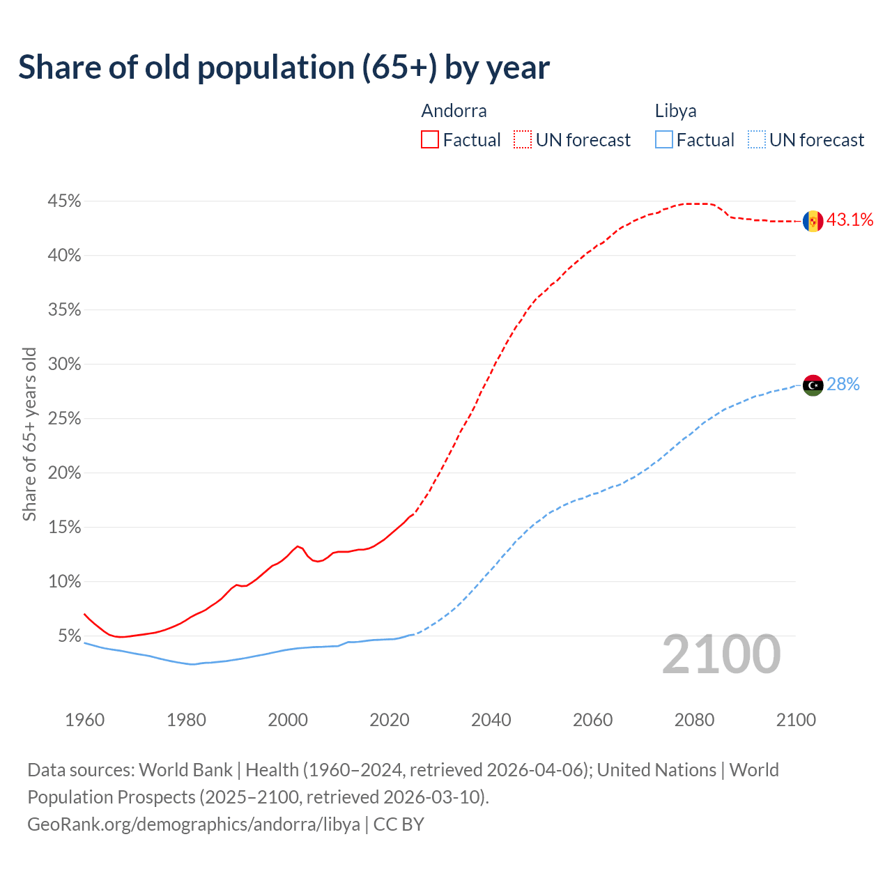 The share of older people aged 65 and over is 15.9% in Andorra and 5.02% in Libya. Life expectancy in Andorra compared to Libya .