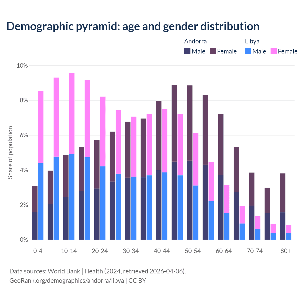- Andorra is ranked 18/196 by median age (oldest to youngest) vs 114/196 for Libya.