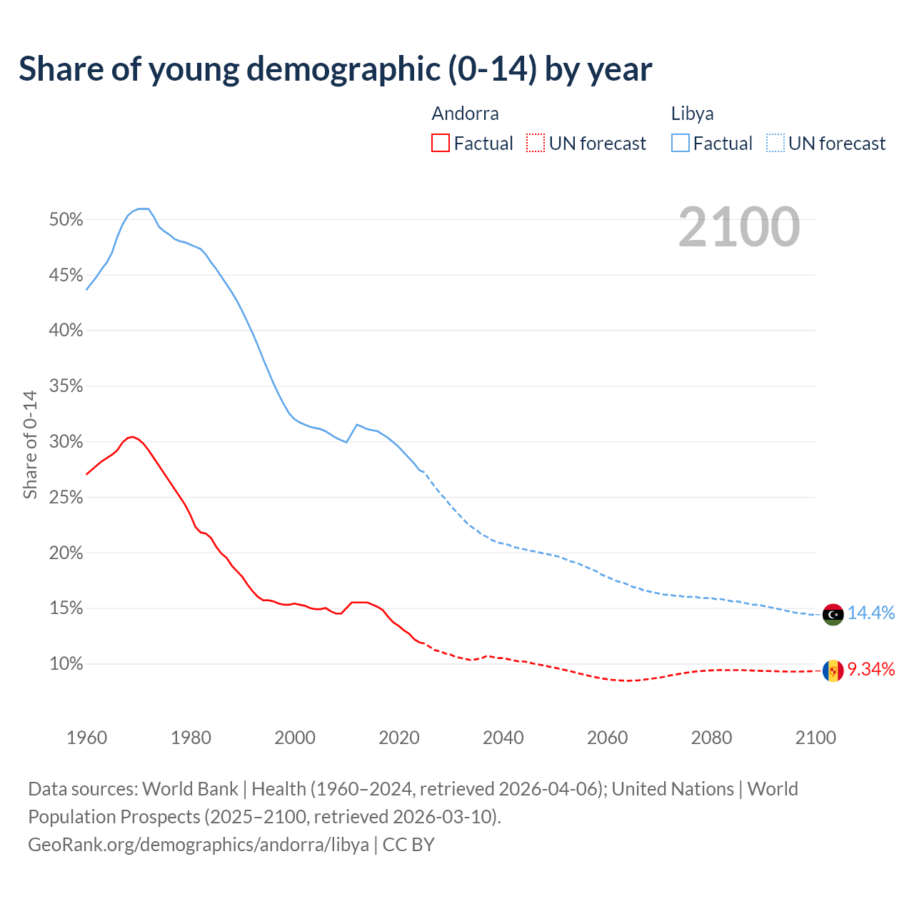 - The share of young demographic (0-15 years old) in Andorra is 11.9% vs 27.4% in Libya.