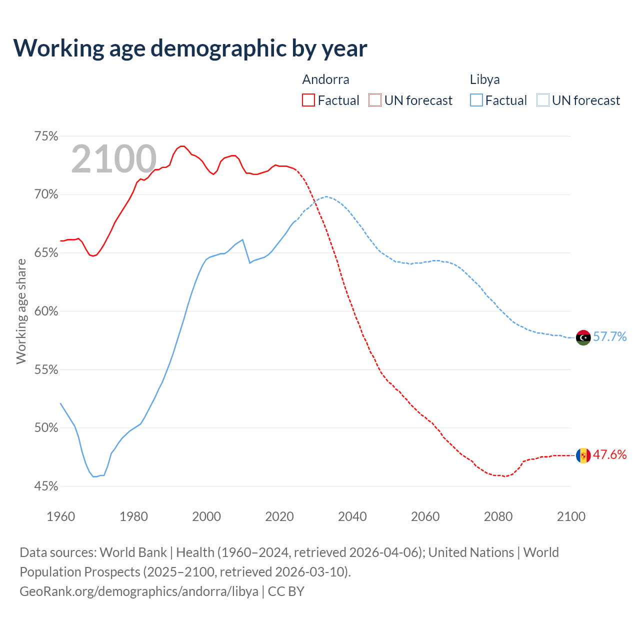 - Andorra has 60.7K working age adults (aged 15-64) vs 5.11M in Libya.