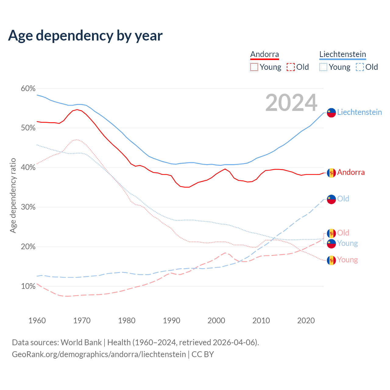- The share of old-age demographic (65+) in Andorra is 15.9% vs 20.7% in Liechtenstein.