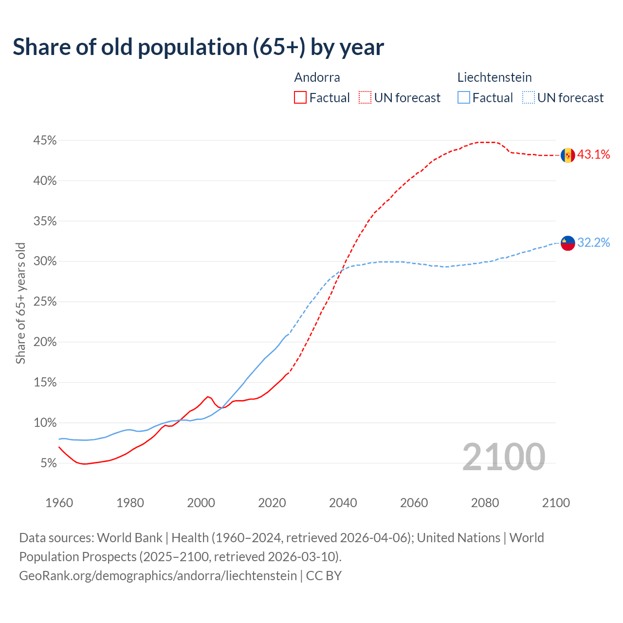 The share of older people aged 65 and over is 15.9% in Andorra and 20.7% in Liechtenstein. Life expectancy in Andorra compared to Liechtenstein .